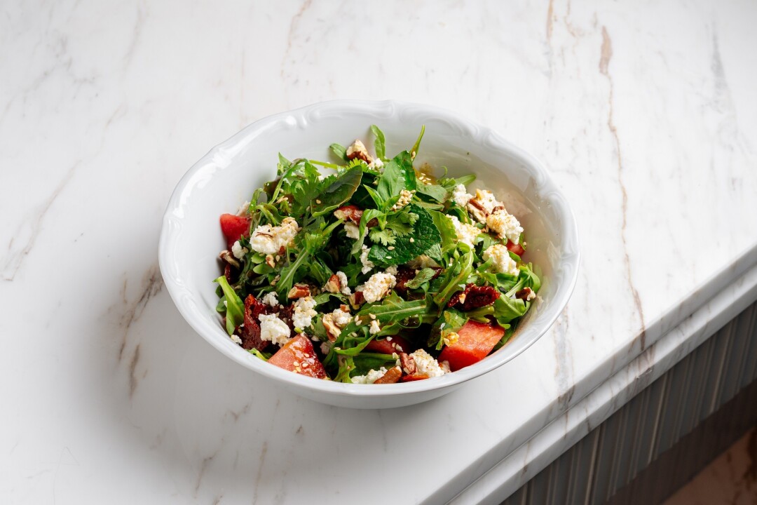 В новом ресторане от группы «Комитет» готовят салат с арбузом, листьями руколы и шпината, орехами пекан и козьим сыром. Всё это объединяет соус на основе бальзамического уксуса, оливкового масла и орегано.
