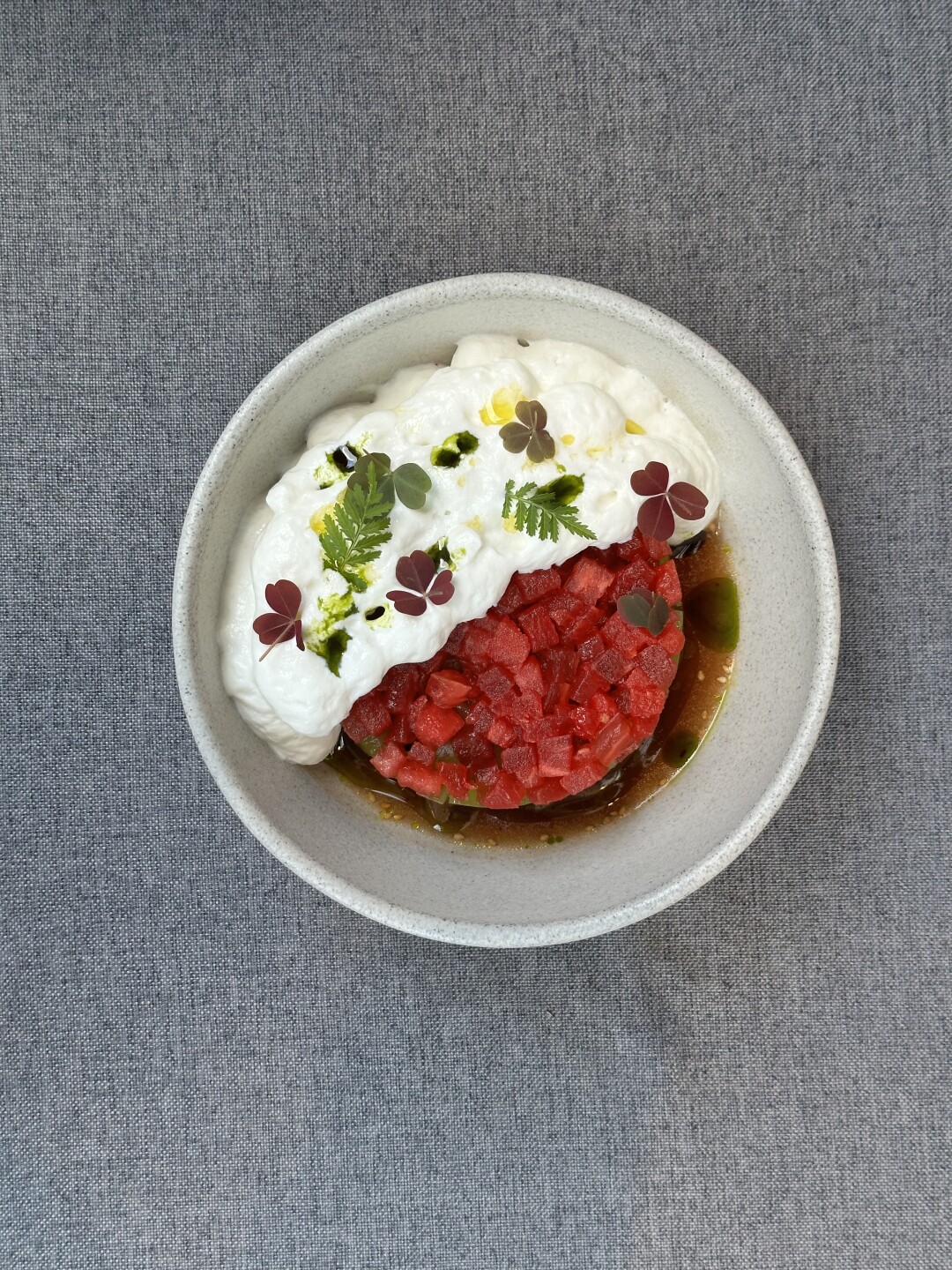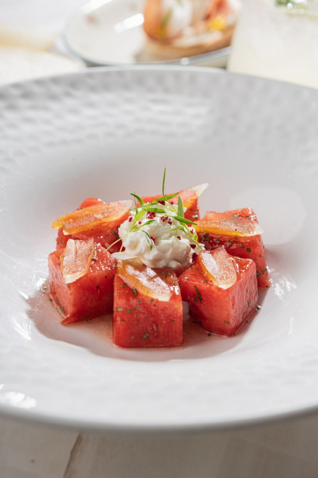 Летнее блюдо, в котором сочетают подкопченного тунца с огурцом, сладким арбузом и азиатской заправкой из понзу, трюфеля и оливкового масла. Сверху всё украшается шапкой невесомого мусса из пармезана.
