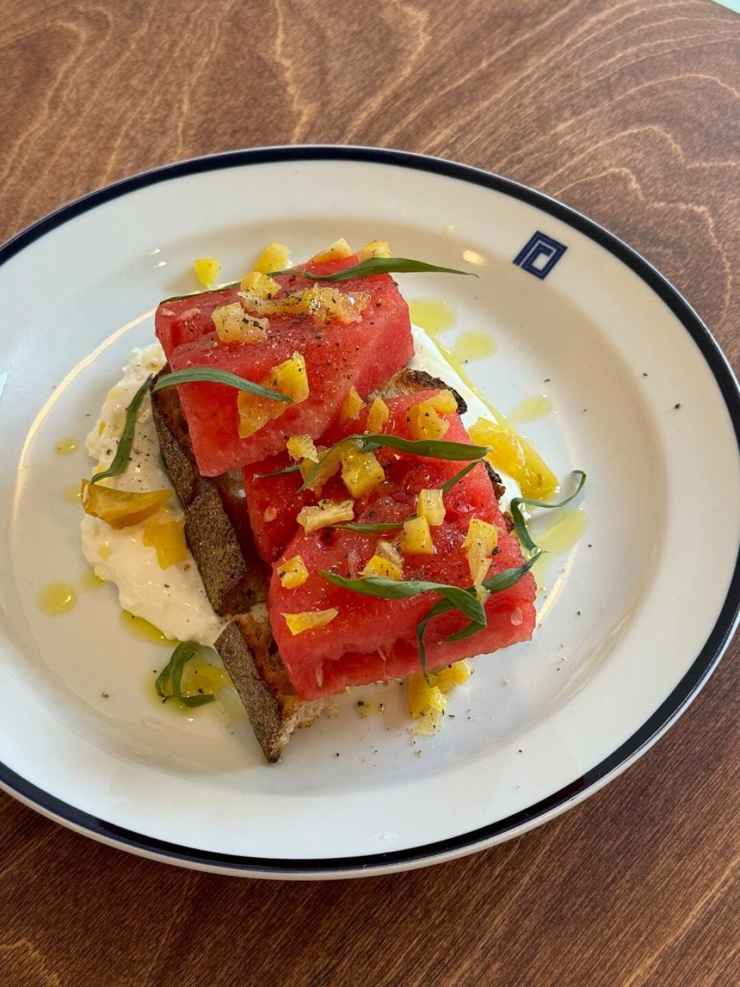Ставку, как здесь принято, сделали на необычные сочетания вкусов: арбуз миксуют со страчателлой, вяленой дыней и соусом из алоэ (в жару идеально). Дополняем блюдо арбузным коктейлем Watermelon Spritz.