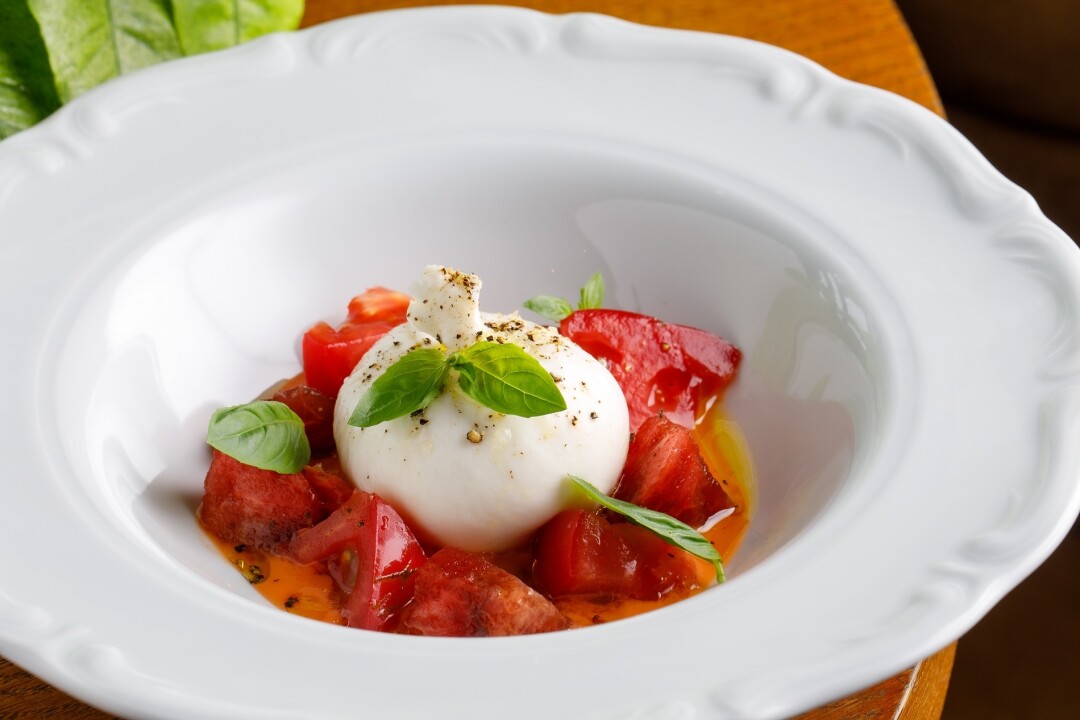 Буррата как продукт, подходящий, кажется, в любой летний спешл, дополняется томатами и арбузом.