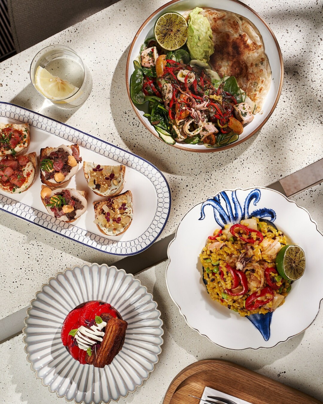 До 20 октября в ресторане действует специальное испанское меню: сет тапасов с кремом рокфор, компрессионной грушей и кедровыми орехами с соусом вителло, с ростбифом и соусом майо из острых перцев или с хумусом из артишока и тартаром из тунца. Следом — пряный томатный суп с морепродуктами, кукурузный крем-суп с запеченным сыром камамбер и криспи-луком и шафрановая паэлья с кальмаром, креветками и гребешком.