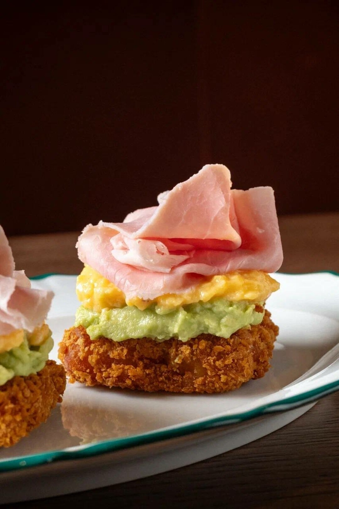 • Хамон, произведенный в фермерском хозяйстве Александра Дмитриева в Ленинградской области, в тарталетке из теста на основе желудевой муки.