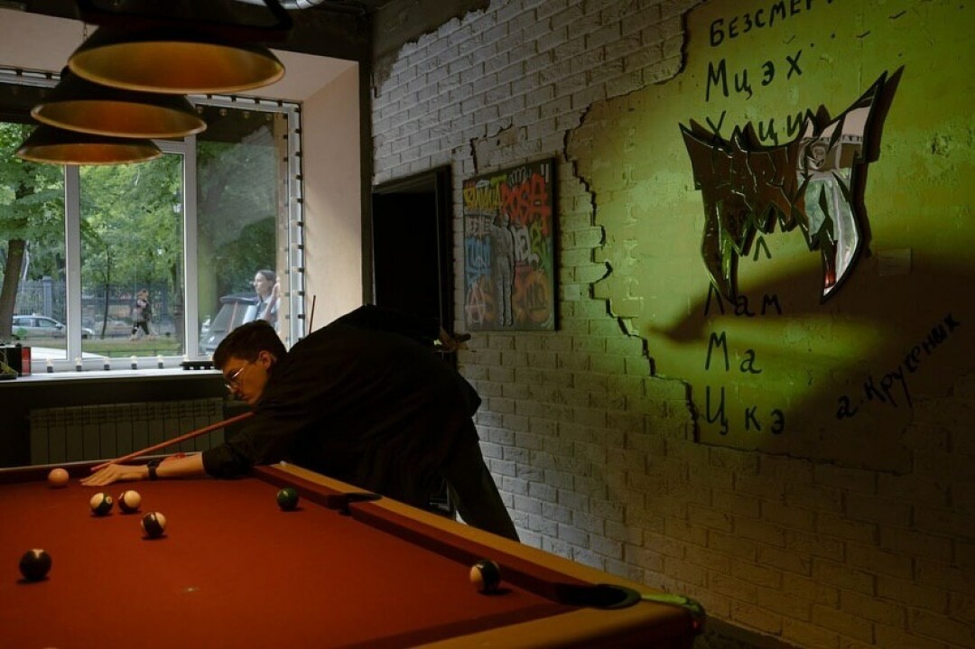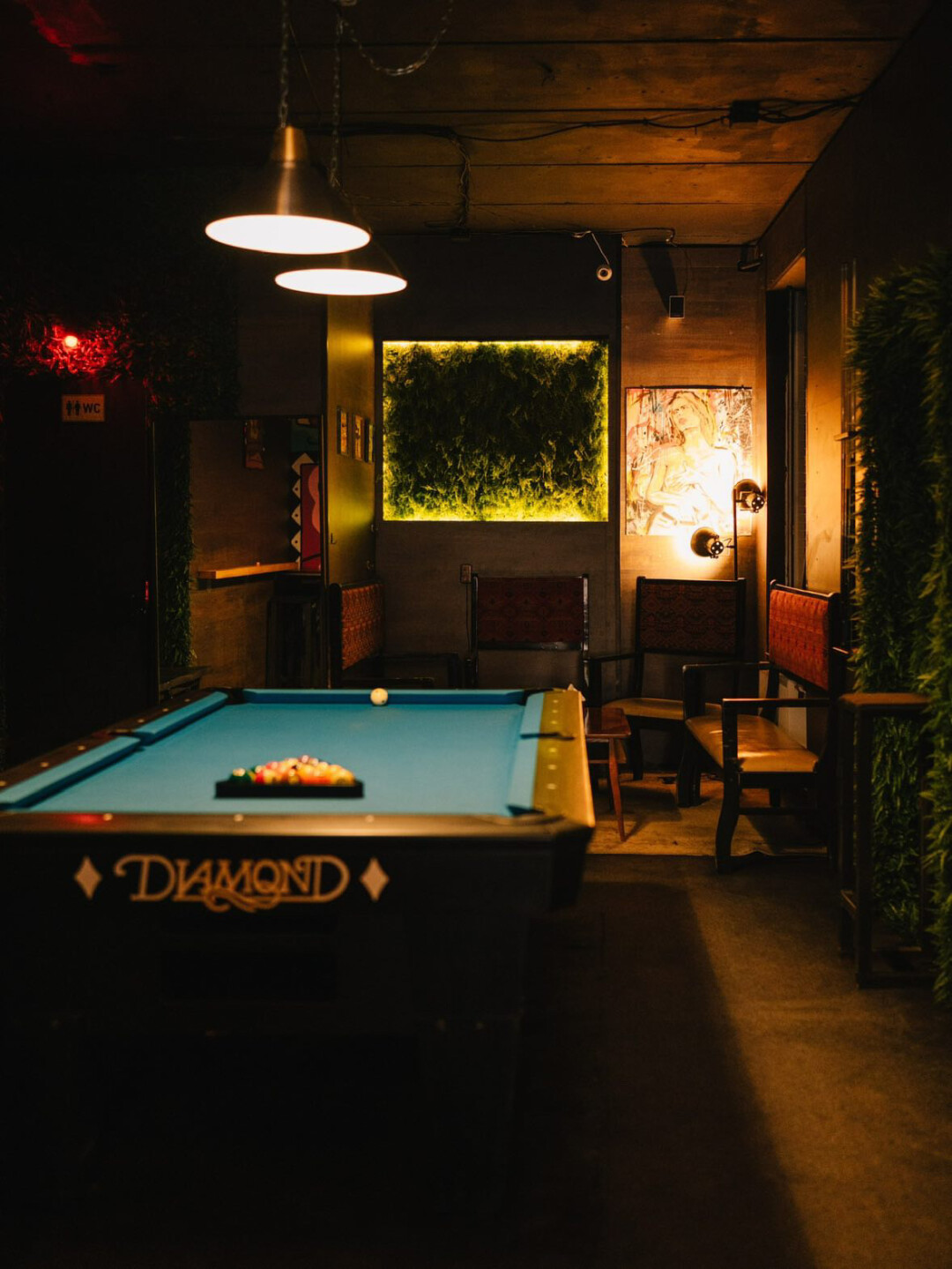 Выставки с участием художников Вовы Цыгана и Васи Базелевса, поэтические слэмы и мрачные танцы под эмбиент-сет: в литературной бильярдной с «кухней земных, но нескучных закусок» и названием в честь поэта и авангардного экспериментатора Алексея Кручёных точно будет чем себя (и компанию) занять. 4 игровых стола с живой очередью, в которой можно растянуть ожидание за поеданием тортильи или тапасов.