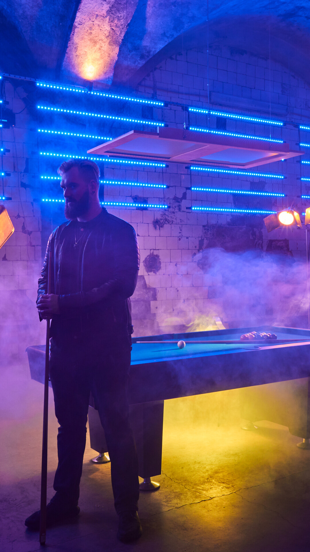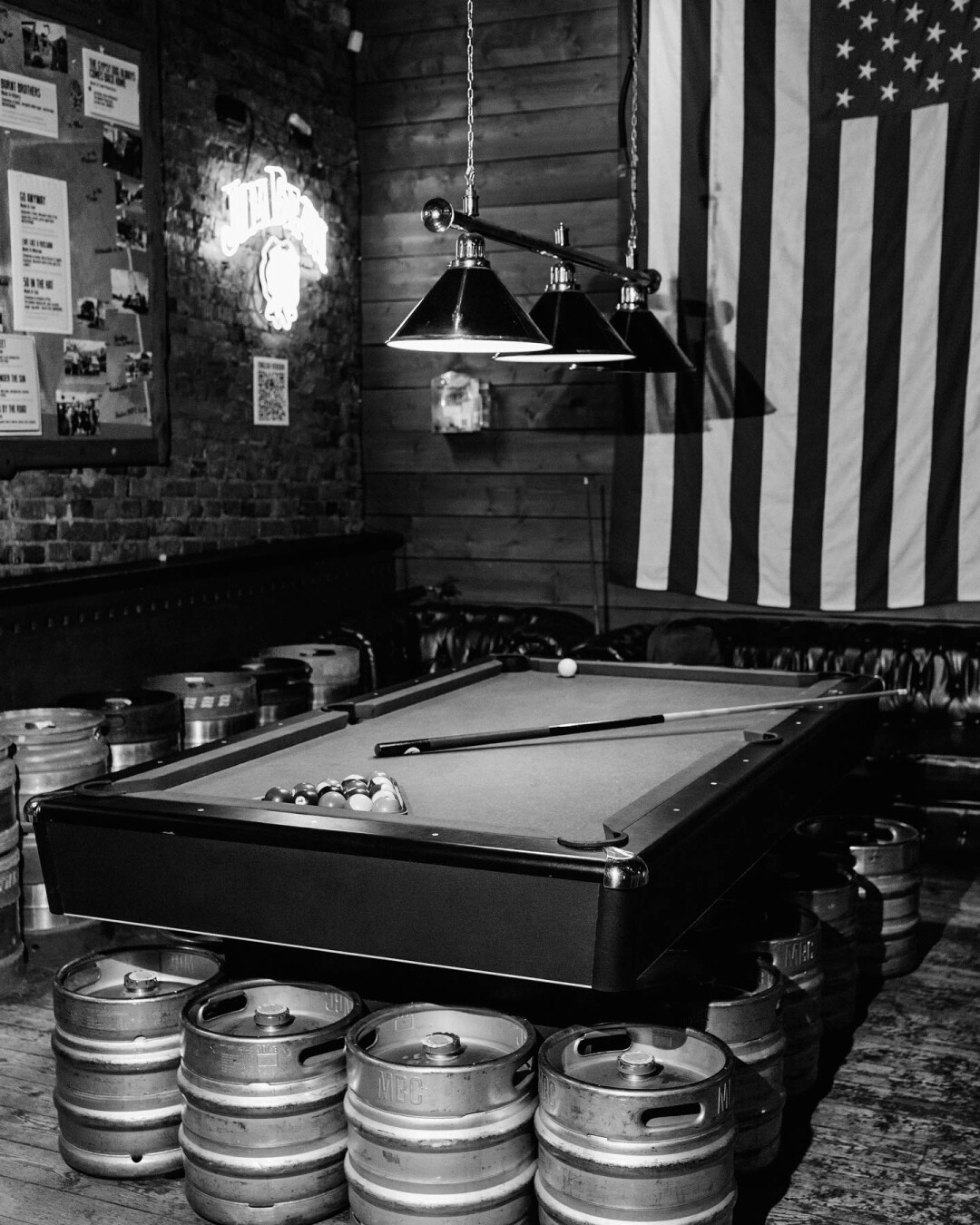Брутальный бар-гараж невозможно представить без бильярдного стола в центре зала! Американский дух закусочной для настоящих байкеров располагает к тому, чтобы неспешно выпить пиво с буррито, совмещая трапезу с точными ударами по шарам на зеленом поле.