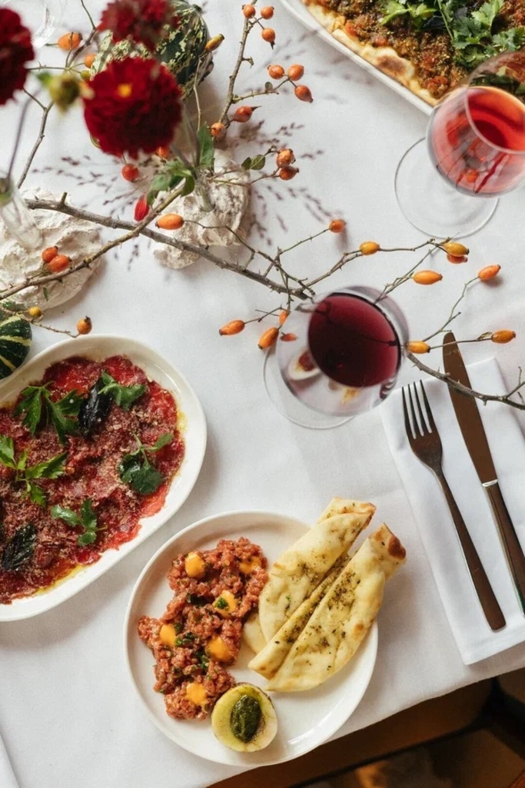 Ресторан современной ближневосточной кухни Cast решил познакомить нас с Кьянти новой волны (сейчас в регионе к управлению приходит молодое поколение виноделов) и ввел специальный сет. В пару к каждому из четырех бокалов (а внутри — аромат фиалок, привкус вишневой косточки и легкий тон растертых в ладонях томатных листьев) пойдет свой курс: тартар из ягненка с костным мозгом и айоли из аджики; карпаччо из говядины с томатной сальсой; лепешка с тапенадом из оливок.