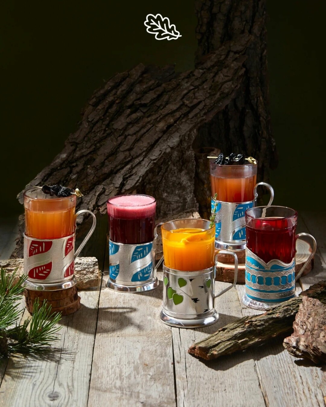 После парения с вениками в «Дегтярных» наполняемся самыми настоящими витаминными сборами: все ягодные композиции и дикие травы из лесов ближних предлагают в самоварном чаепитии с малиновым вареньем. С имбирем сочетают кислую лесную бруснику, а напиток из черной смородины делают с ароматным можжевельником.