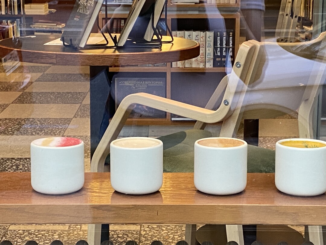 Латте со вкусом брусники с легким шлейфом тимьяна, раф с кардамоном, какао с добавлением безалкогольного биттера на основе соков апельсина, малины, вишни и добавлением трав и твист на облепиховый чай с шалфеем. Все это потребляем за книжкой в букинистическом магазине.