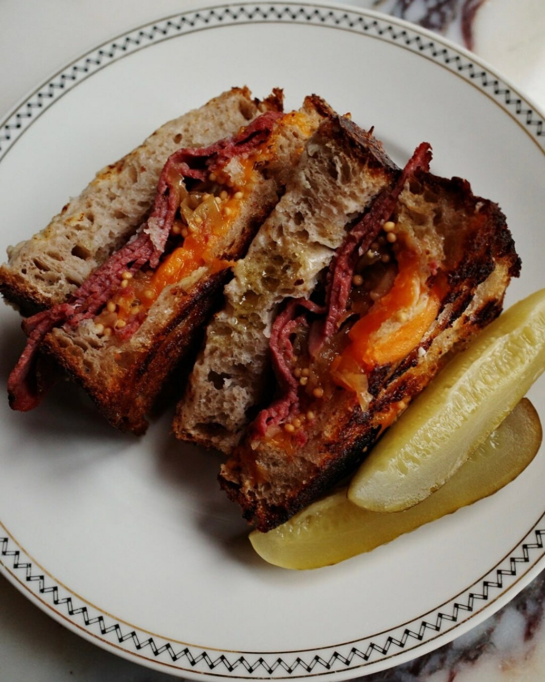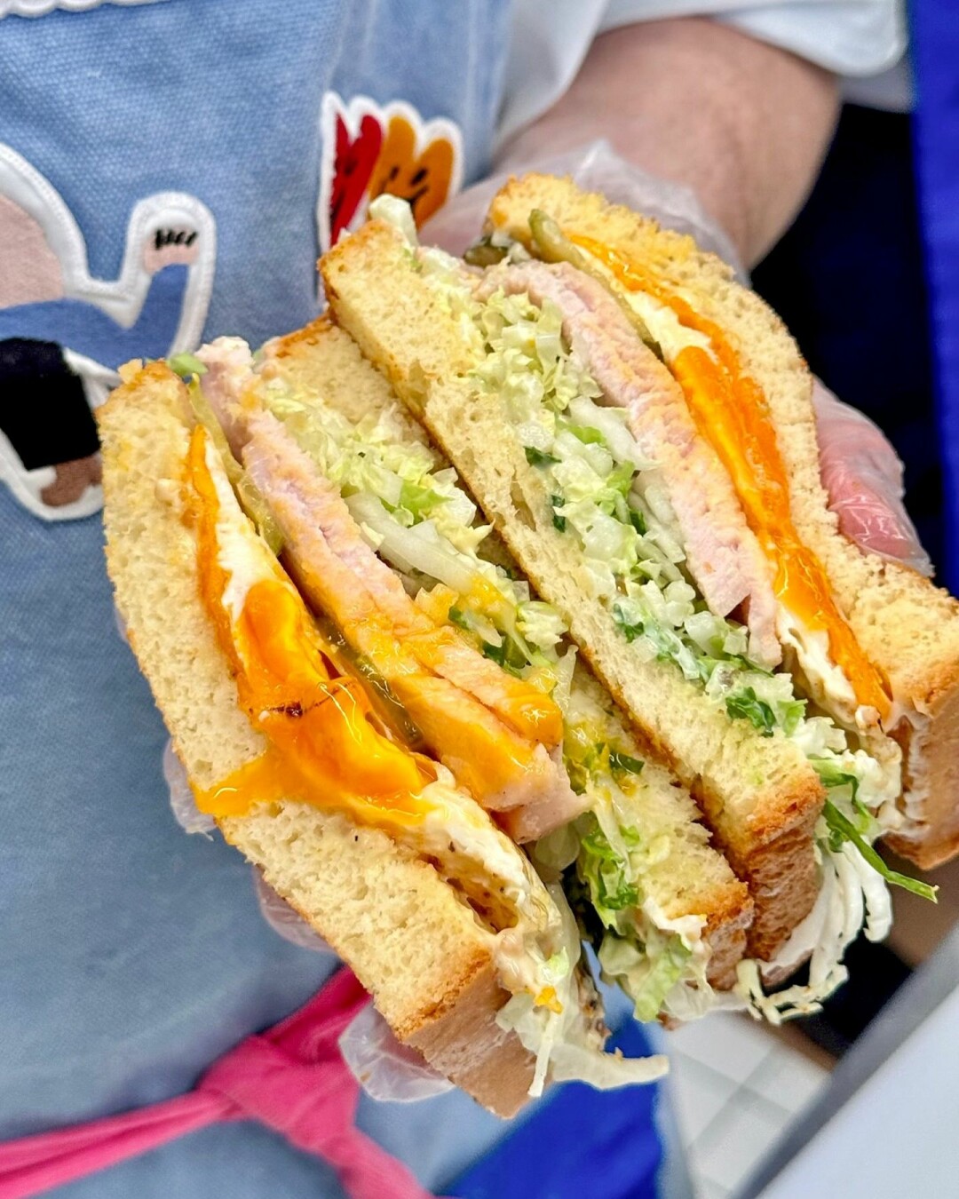 Сытнейший бутерброд делают из двух обжаренных кусочков бриоши, горчичного соуса с карри, капусты, малосольных огурцов, чеддера, глазуньи и большого слоя пастрами из индейки. Помимо этого могут сделать сэндвич из круассана с докторской колбасой.