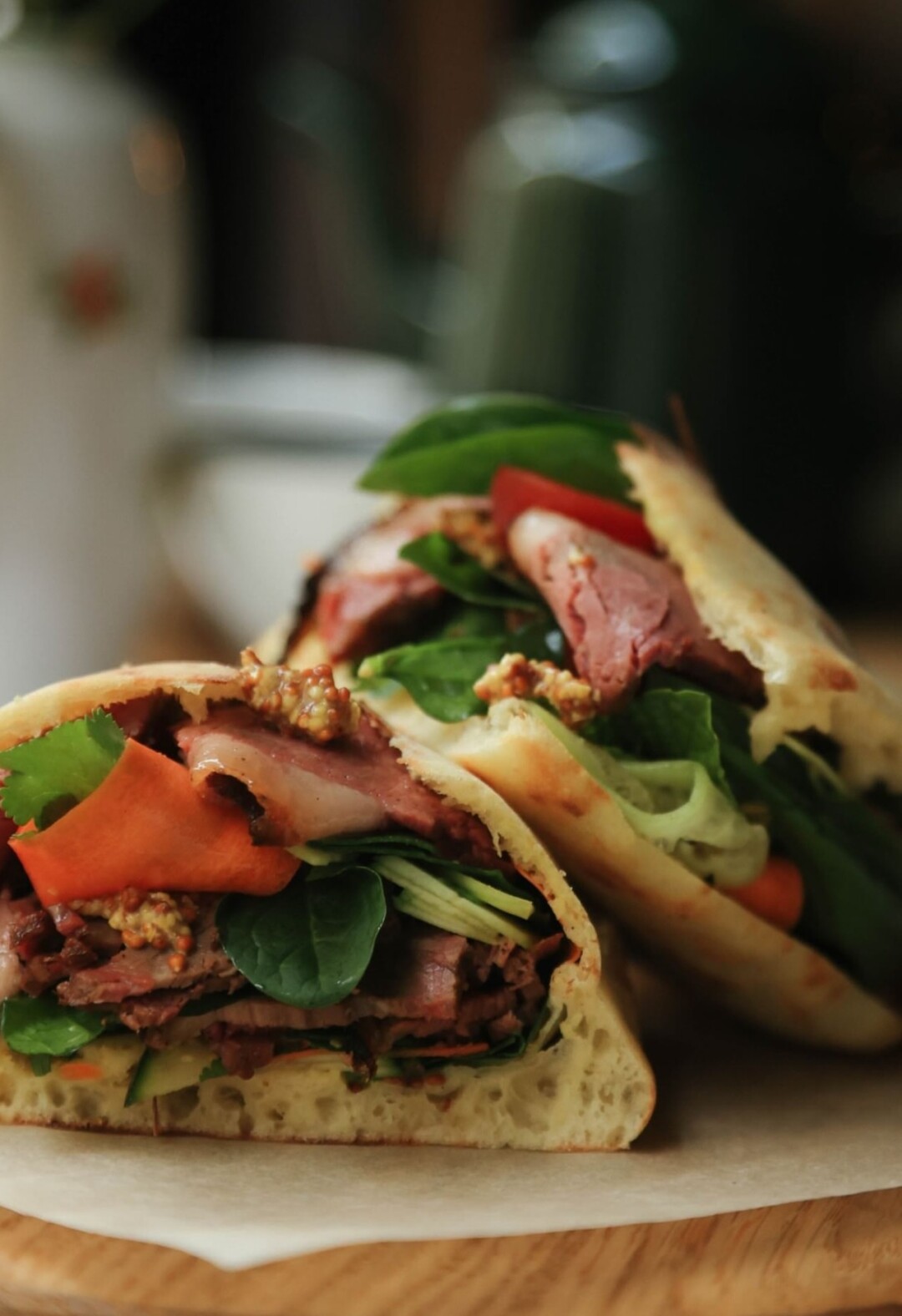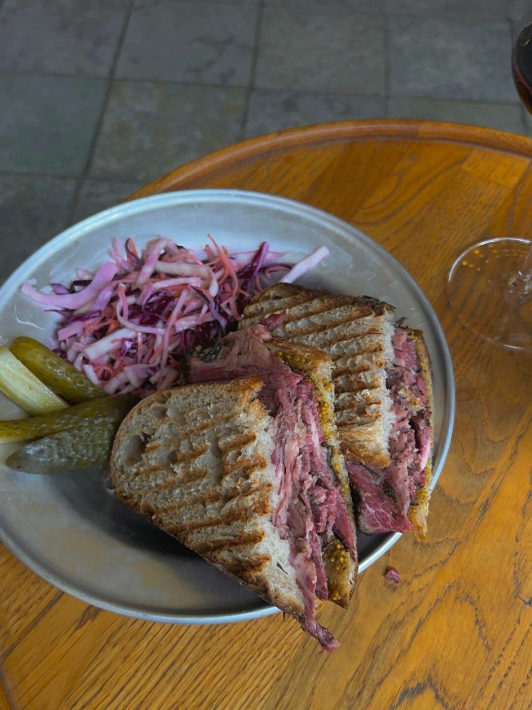 В винно-мясном кафе, что находится в Андреевском дворе, готовят сэндвич (ремесленный хлеб на закваске!) с удивительной порцией пастрами. Запекается в гриле и подается с салатом коул-слоу и соленым огурцом