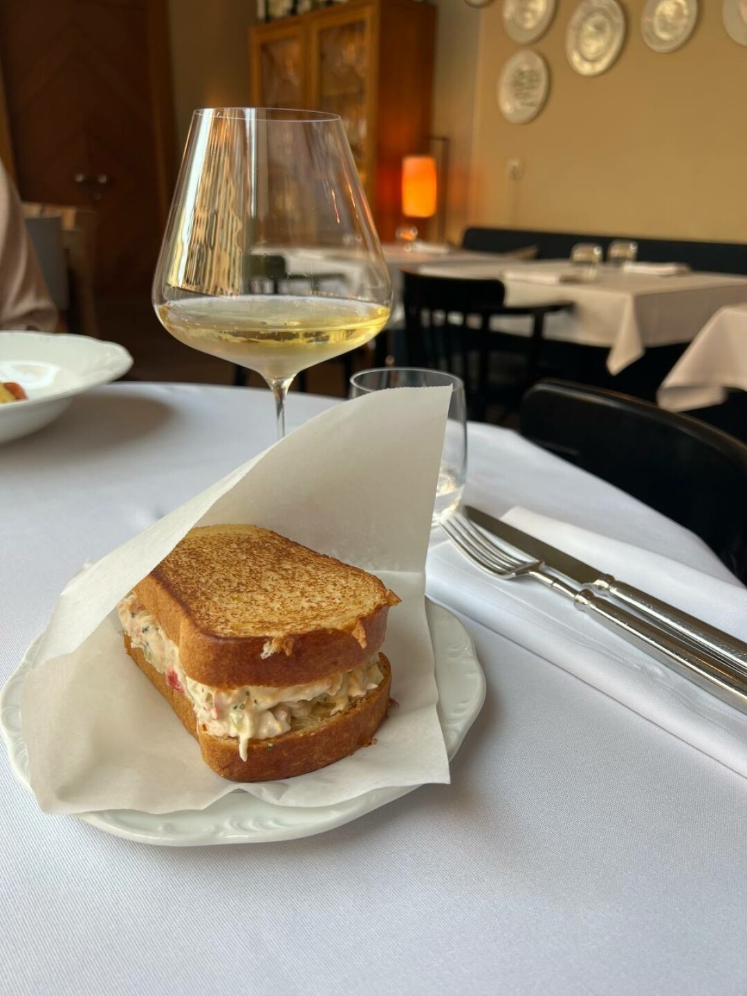 Роскошный завтрак выходного дня: сэндвич с крабом, домашним майонезом и зеленью в воздушной булочке бриошь и бокал шампани в Probka.