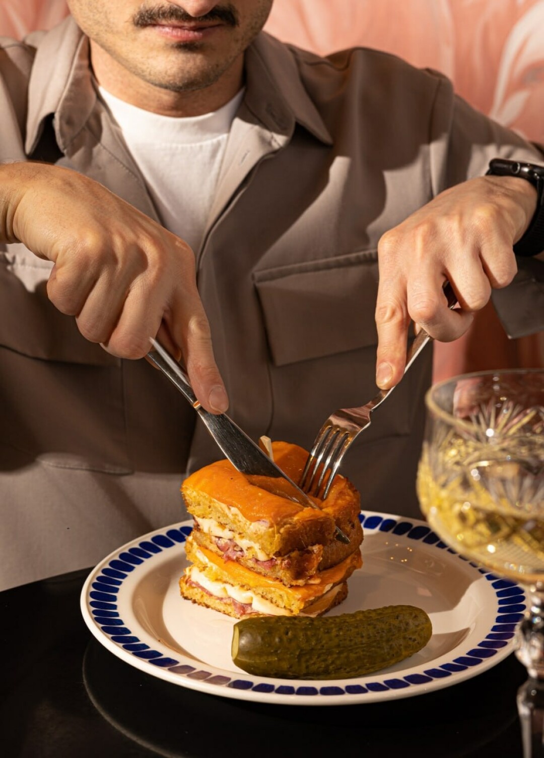Стоит присмотреться к новоорлеанскому сэндвичу муффулетта в Nola: такого нет нигде (фото сделано для совместных завтраков-коллаборации Nola и Charlie). Это многоэтажный бутерброд с прошутто котто и соусом из печеного чеснока, который подается с куриным бульоном и соленым огурцом.