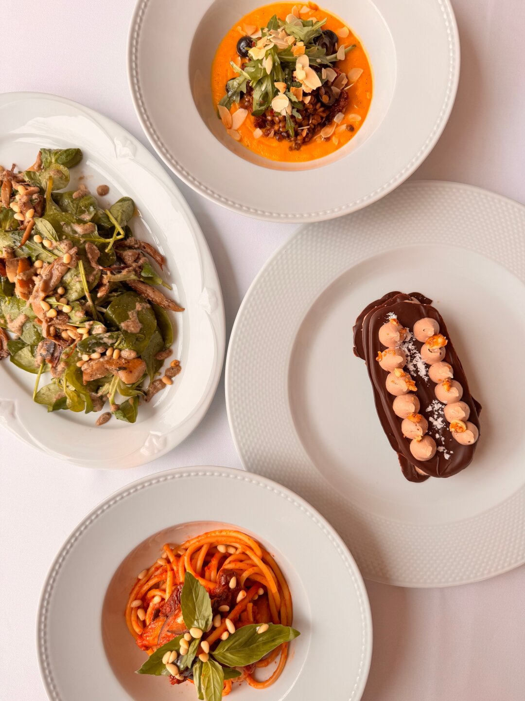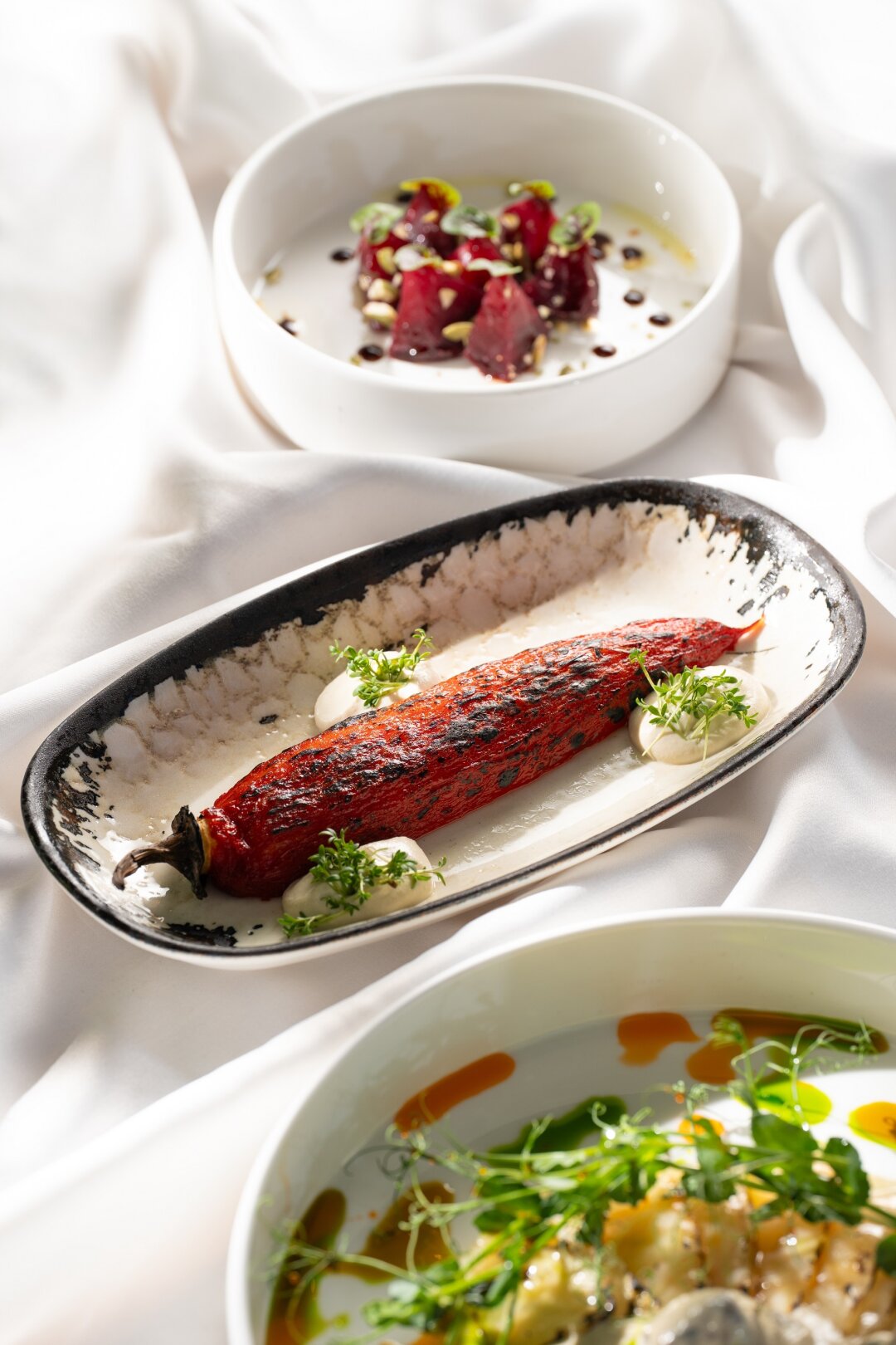 В итальянском Percorso карпаччо из свеклы сервируют кремом из сельдерея, чипсами из топинамбура, клубничной гранитой и фисташками, в ризотто на основе риса карнароли Acquerello добавляют тыкву, белые грибы и душистый тимьян, а спагетти из региона Gragnano приправляют чесноком и свежим перцем чили.