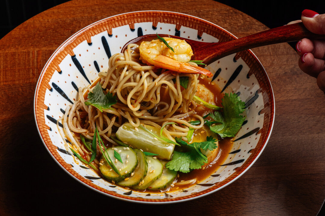 За чем идти? Точно пробуйте рамен на упругой и пластичной карбонизированной лапше, которую в Miyu тянут сами: рамен варят на насыщенном курином бульоне, который готовится более 12 часов, и дополняют топингами от курицы кацу до кимчи. Наш выбор: острый тантанмен со свининой часю, томленой 8 часов в соевом соусе. По корейской традиции в меню ввели панчаны — миниатюрные закуски к каждому приему пищи. В Miyu это хе (рыба в пряном уксусном соусе с куриным бульоном и битыми огурцами), древесные грибы, маринованные в соевом соусе и пасте кочудян с имбирем, а также ананасы кимчи (сочетайте с «гайдзин негрони» с водкой на кокосе!). И важно знать! Винил для Юры и Иры — часть концепции. Поэтому power couple готовит летнюю террасу и планирует проводить олдскульные хип-хоп-вечеринки (от 2Pac и Wu-Tang Clan до Xzibit и Outkast).