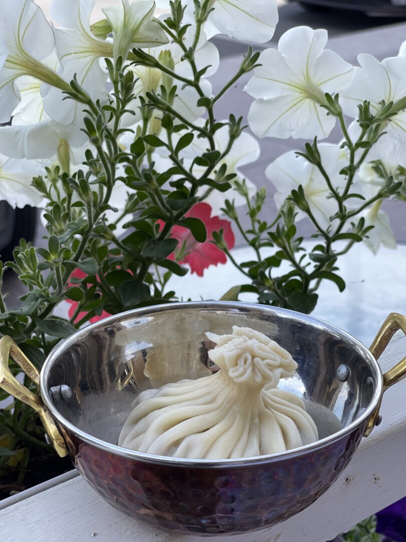 Скучаете по безупречной грузинской кухне? Звоните Марусе. Так ласково зовут Марину Наумову постоянные гости ее террасы с видом на Академию художеств и Неву. Ювелирные хинкали с восемнадцатью складками, нежнейшие кучмачи, сезонные блюда (цветы цукини — идеально к розовому!), а ведь есть еще спецэффекты от маэстро: фирменный сорбет из фруктов и ягод Маруся готовит с помощью жидкого азота при –196 °C. «Всё поженилось!» — вторим счастливым молодоженам: по соседству — Дворец бракосочетания № 1.