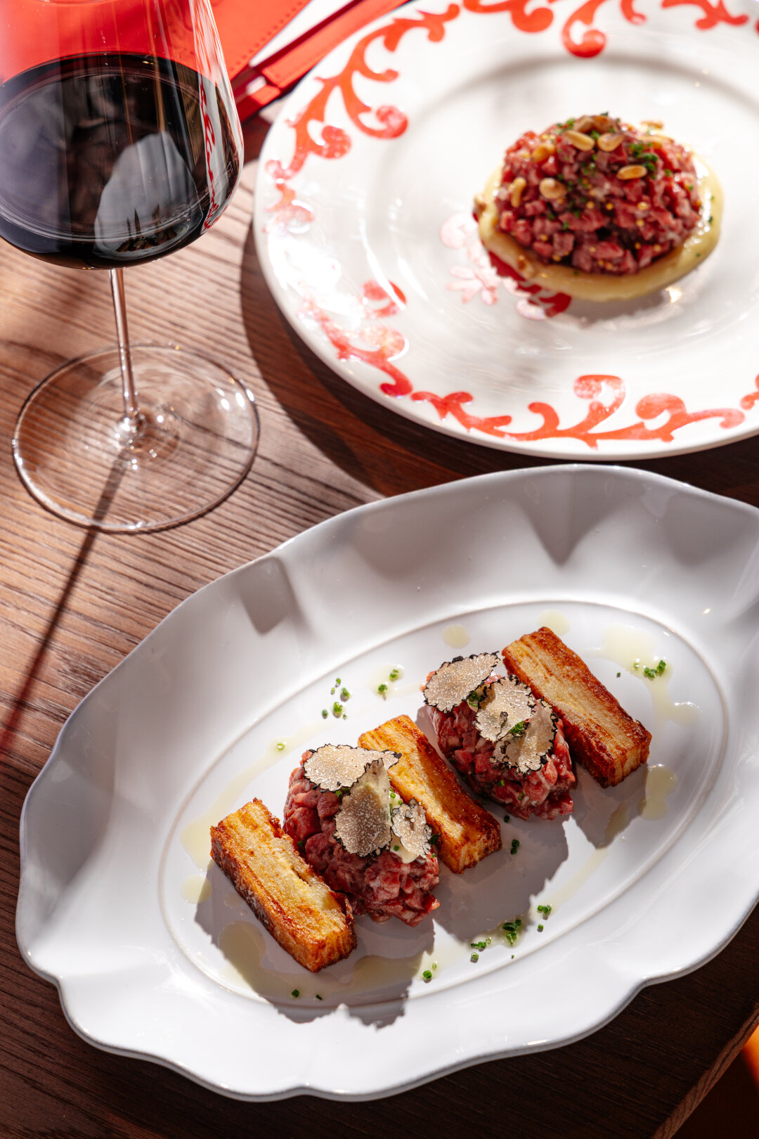 В ДНК нового ресторана Дмитрия Блинова и Рената Маликова — мясо: от шатобриана и ребра бычка до курицы в корейском барбекю и слоеного пирога из кролика со сливочным соусом из пармезана и копченого сыра. Молодой прорывной шеф-повар Андрей Ковалев также отвечает за кухню в Tartarbar и не забыл про тартар в Reborn: готовит его из ягненка, дополняя желтком. Но особенно Блинов и Маликов рекомендуют фуа-гра — тающую во рту печень Ковалев оркеструет вялеными абрикосами в амаретто с соусом жу и маслом черного перца.