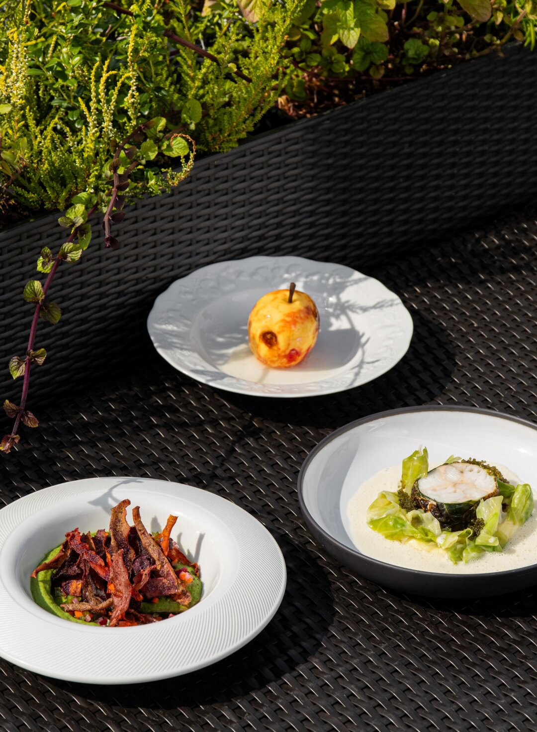 Бренд-шеф Николай Хвалынский специально для фестиваля устойчивой гастрономии «О2» наладил на своей кухне безотходное производство: из овощных очисток получаются чипсы, которые подают к хумусу с винегретом из соленых овощей, а из рыбных костей, креветочных панцирей и пахты готовят соус к террину из трех рыб в капустных листьях. Аттракцион на десерт — «Битое яблоко» из мусса с рисовым грибком коджи и конфитюра из черненого яблока. Экоменю действует до 14 сентября.