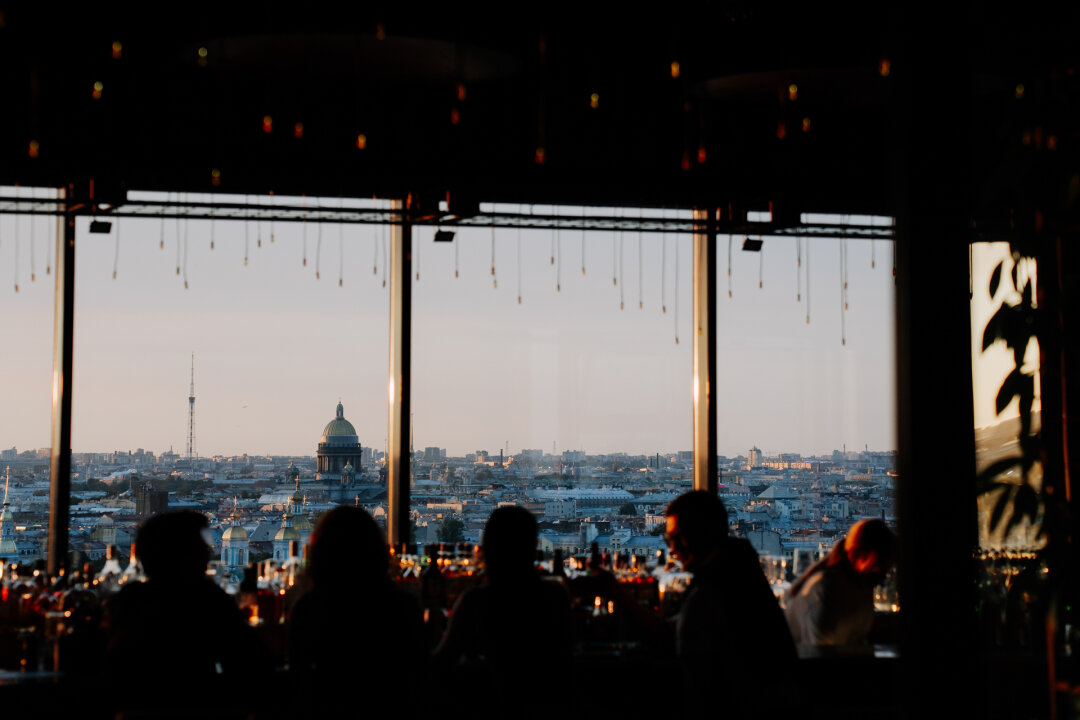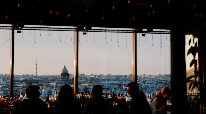 В панорамном ресторане при отеле «Азимут» (первое высотное здание в Петербурге!) — исключительный, мой любимый вид на город: только лишь стеклянная стена отделяет нас от крыш исторической застройки центра, Фонтанки, шпиля «Лахта Центра» и соборов — Исаакиевского, Николо-Богоявленского морского и Троице-Измайловского. Рекомендую борщ «по-казаковски» от шефа F11 Игоря Казакова. Бульон на запеченной свекле, говяжья шея крупным кубиком и тарелка с салом, сметаной, хреном, горчицей и бородинским хлебом в виде маффина. Идеально с рюмкой беленькой!
