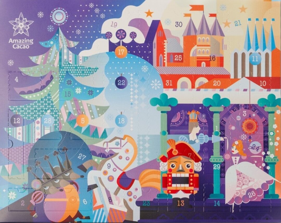Петербургский шоколадный бренд с философией «от какао-боба к шоколадной плитке» (команда знает в лицо всех фермеров Перу, Колумбии и Эквадора, с которыми работает, берет призы на International Chocolate Awards, представляет Россию на международных профильных выставках в Китае и ОАЭ) дропнул адвент-календарь «Щелкунчик». 31 окошко с фигурным шоколадом и вкусами от бородинского хлеба, черного чая с лимоном до гречневой крупы, рябины и сосновых шишек.