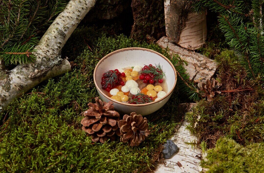 Шеф ресторана русской кухни при Дегтярных банях делает нарядный холодец из бедра говядины с моченой брусникой. Сверху ювелирно украшает блюдо ягодами, горчицей и хреном. Нам такое надо!
