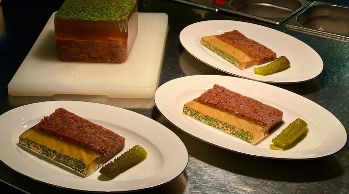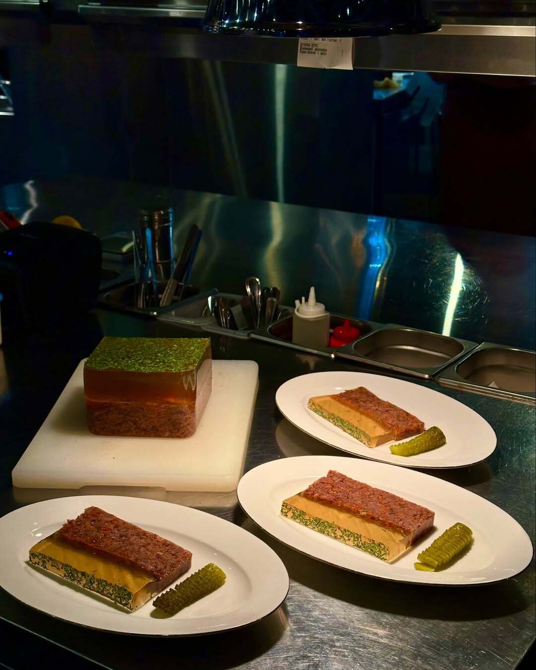 В «Лучшем новом ресторане на каждый день» по версии премии «Что где есть в Петербурге» — 2025 студень делают на крепком наваристом бульоне из поросячьих копыт и хвостов телят зернового откорма. Варят долго, чтобы получилась плотная консистенция с мягким мясом. Подают со сливочным хреном, соусом из зернистой горчицы с медом и листьями свежего салата.