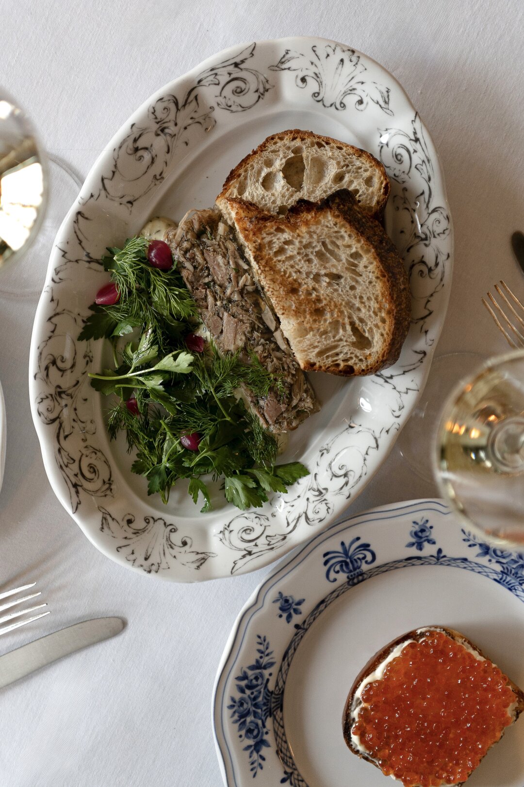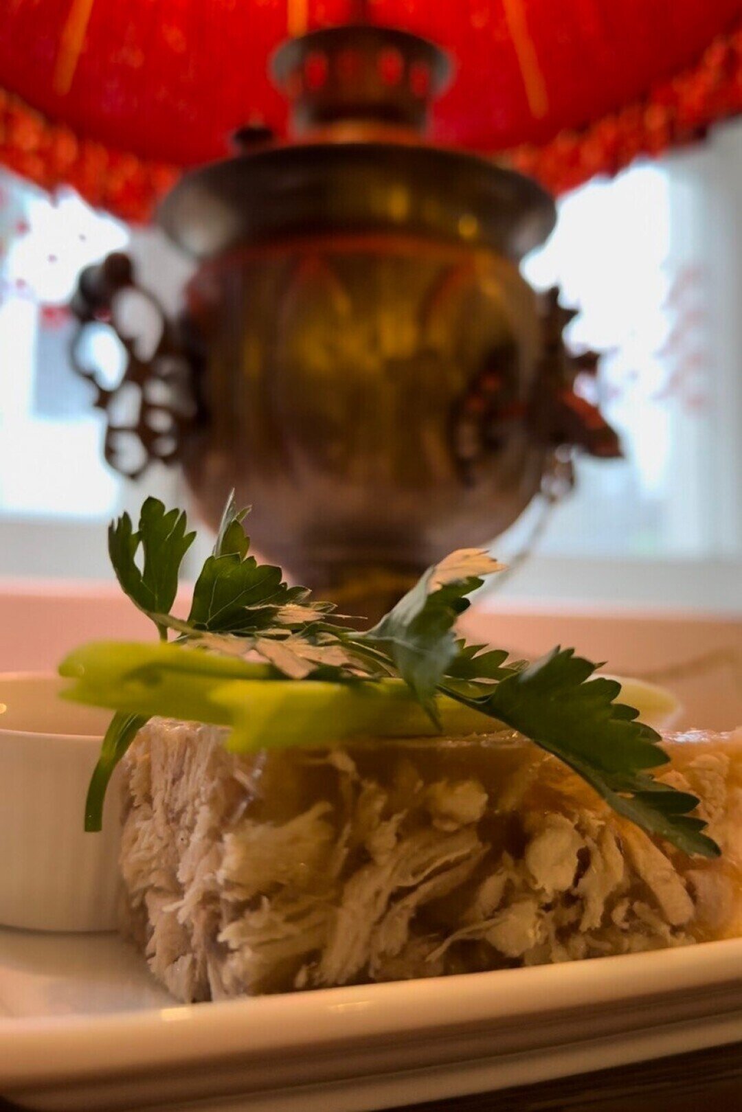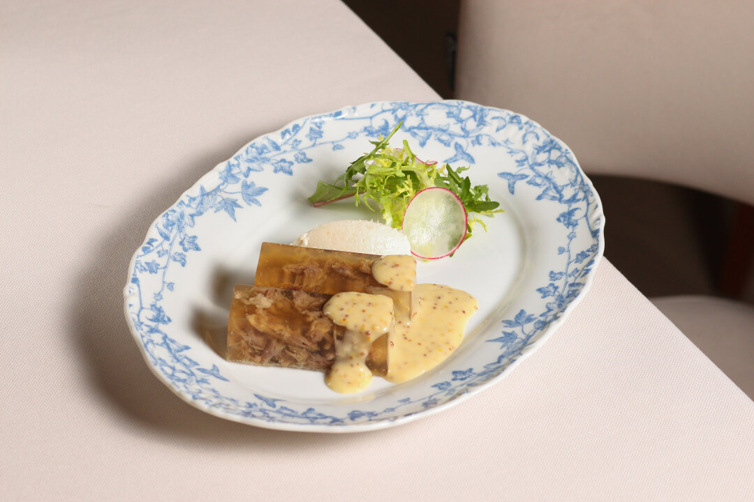 Солидный холодец готовят в русском ресторане прямо напротив Адмиралтейства. Его варят на куриных лапах (курицы зернового откорма!), добавляют печеные лук и морковь, сервируют домашней горчицей и хреном, тоже собственного производства.