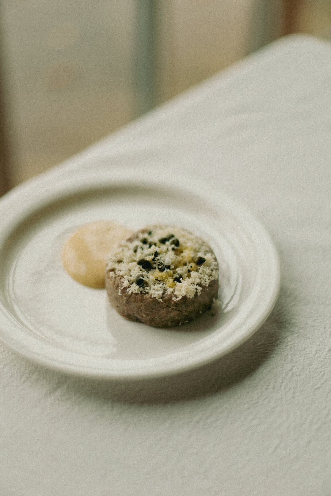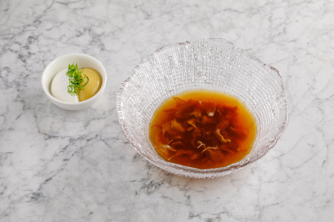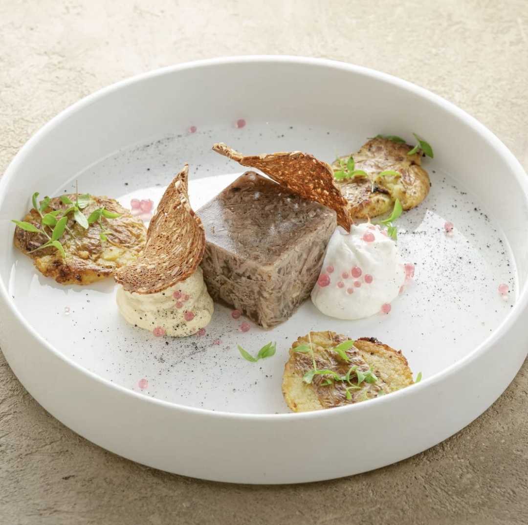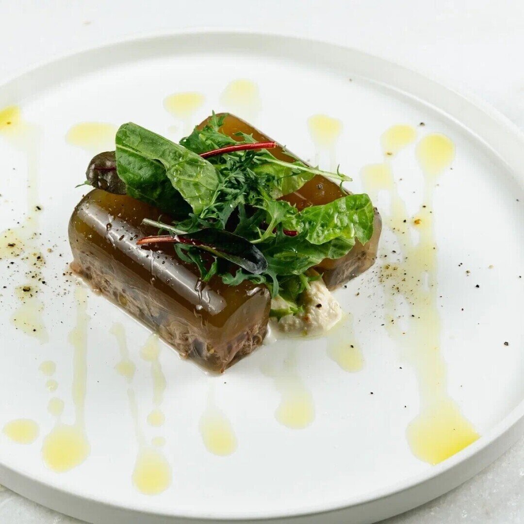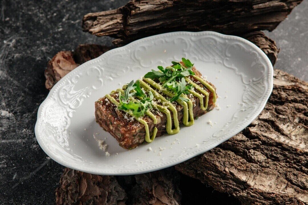 В этом холодце встречается неочевидный гастрокраш — артишок! Бульон из бычьих хвостов и мозговых костей варят сутки, щеки коптят и томят, добавляют маринованный артишок и жареные боровики. Сверху натирают хрен и поливают соусом из сицилийской фисташек и дижонской горчицы со специями.