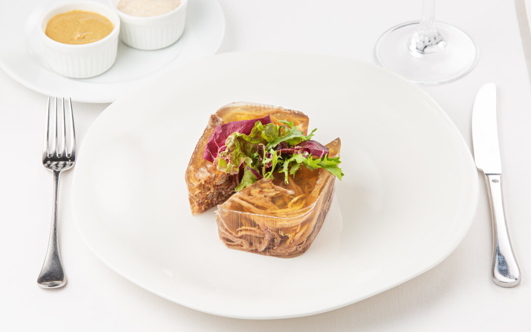 Ультраколлагеновый холодец из насыщенного бульона с бычьими хвостами, говяжьей голенью, пряным чесноком, вялеными томатами и запеченой морковью. Гастрономический хэндмейд, который мы заслужили. На отдельной тарелке — идеальная пара — горчица и сливочный хрен.