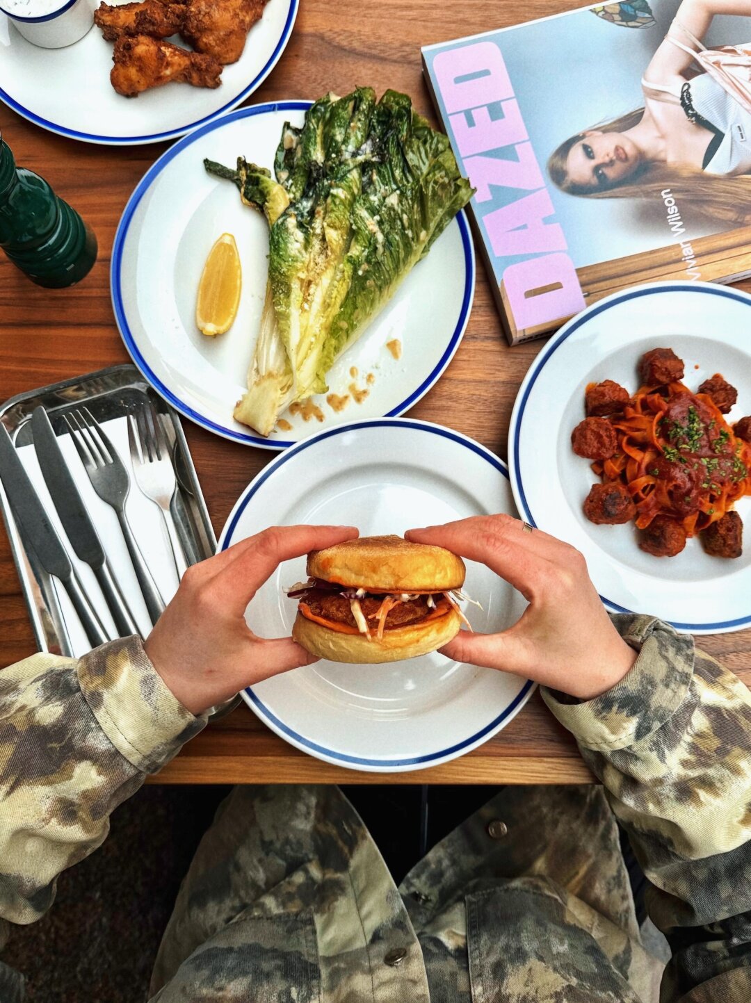 В сканди-кафе рядом с Манежной площадью —появились одинаково уместные под любой жизненный случай блюда: крылышки буффало с дзадзики, домашняя паста фреска с митболами (привет «Леди и Бродяге»), денвер с картофелем фри. Отдельного внимания заслуживает сытный маффин с курицей в панировке и коул-слоу. Завтраки, кстати, подают целый день, с 10:00 до 23:00.