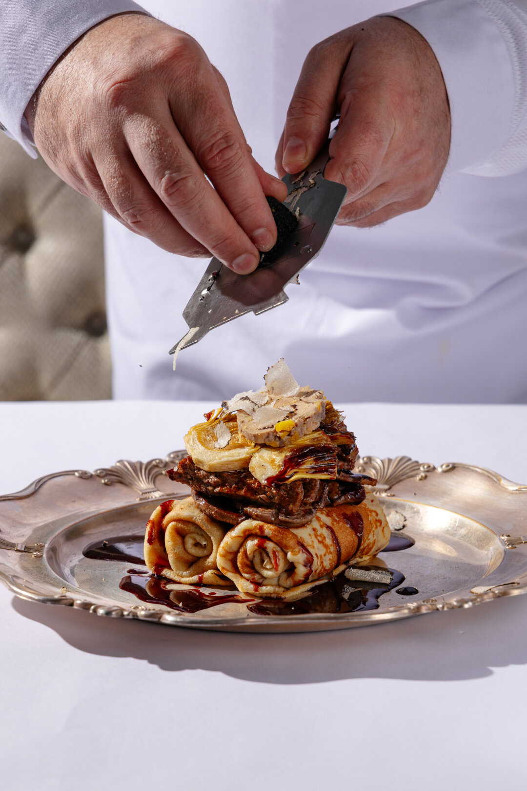Шеф-повар Дмитрий Решетников дал премиум-высказывание на блинную тему. В MON CHOUCHOU готовит креп Турнедо Россини – классическое блюдо французской дворцовой кухни в масленичной интерпретации — со стейком миньон, фуа-гра, чёрным трюфелем и соусом на основе красного вина.