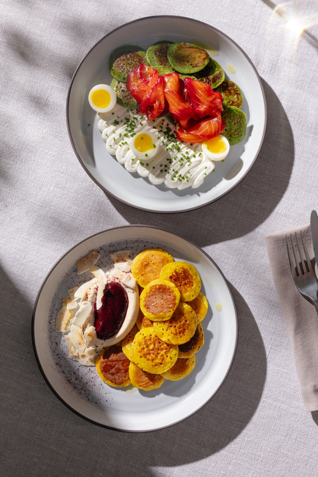 Масленичная неделя здесь проходит под знаком сытных завтраков. Шеф Вадим Куликов придумал два полноценных утренних блюда на основе мини-оладьев. В первой, зеленой, версии они готовятся с добавлением шпината и подаются с карельской форелью слабой соли, кремом из феты и перепелиными яйцами, а во второй — с тыквой, кремом из кокоса и вареной сгущенки и конфитюром из черной смородины.