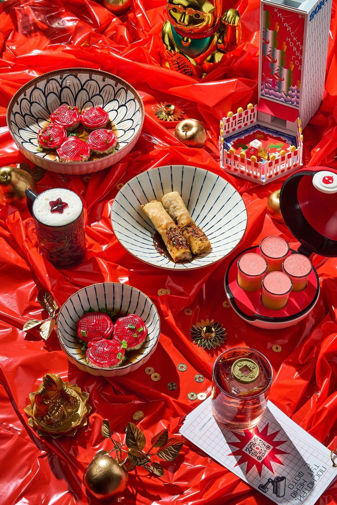 В японском ресторане Saigo вдохновились символикой года Красной Огненной Лошади. Пробуем спешл-коктейль «Два счастья» с авторской подачей из двух частей (задумана как последовательность пожеланий на год), а также сет традиционного китайского напитка байцзю, и лунный пряник юэбин.