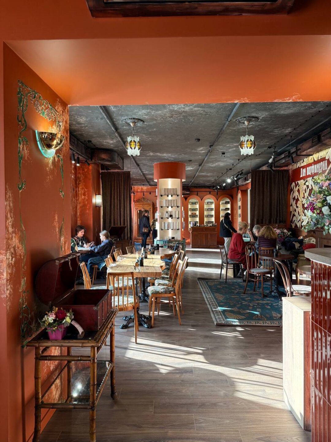 Парфюмерная кофейня в доходном доме Елисеевых XVIII века! На Мойке открылся проект от нишевого бренда Empire Zone. Во-первых, вид на набережную и Зеленый мост. Во-вторых, интерьер украшают антикварная мебель в духе позднего модерна, старинная французская печь и элементы декора, созданные руками современных художников. В меню — кофейные напитки, чай, аперитивы, грушевый и вишневый пироги, авторские круассаны и пирожные.