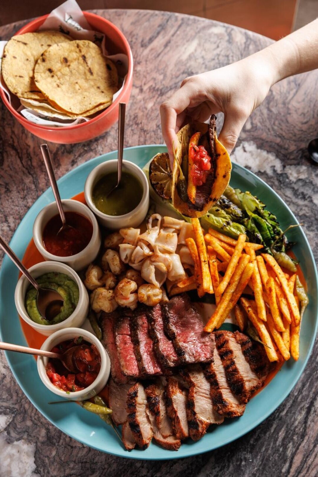 Всем тако! Бренд-шеф Сергей Гальцев и шеф Павел Ермишкин обновили меню в мексиканской кантине. В центре внимания аргентинские креветки из хоспера со сливочным биском с комбу, шиитаке и чиабаттой. Овощи из печи сервируют с чимичурри, а для компании подготовили мясной тако-сет: большую тарелку с мясом из хоспера, морепродуктами, тортильями и соусами. В финале — тако-десерт с ягодами и йогуртовым кремом. А за фразу Buenos días! дарят комплиментарную «Маргариту».
