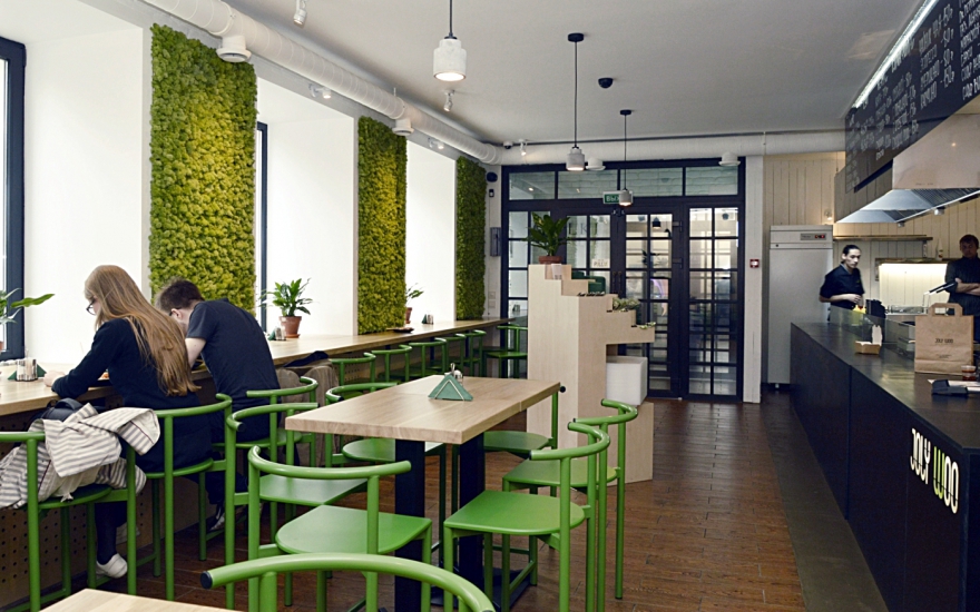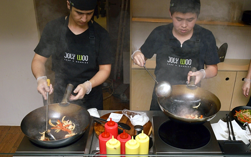 В Joly Woo все здорово — бодрый интерьер, четкая система обслуживания с номерками и звонкой системой оповещения, лаконичное меню и действительно свежий азиатский стритфуд, который делают на открытой кухне. Заказав стеклянную лапшу с креветками на воке, ты видишь, как ее тут же за стойкой начинают готовить. Канонический фо бо, который можно взять целым литром, гарнирован луком ростками пшеницы, красным перцем и тремя видами зелени. Свежие роллы с креветками —хорошие: присутствующий с них авокадо соединяет всю начинку. Отобедав тут меньше, чем на пятьсот рублей, можно выпить за удачную сделку — женьшеневый чай, например, или апельсиновый смузи.