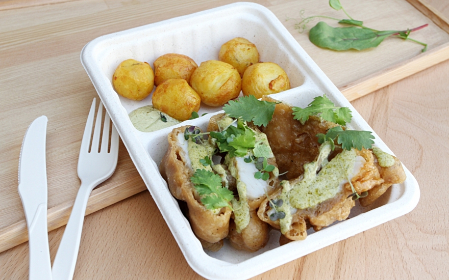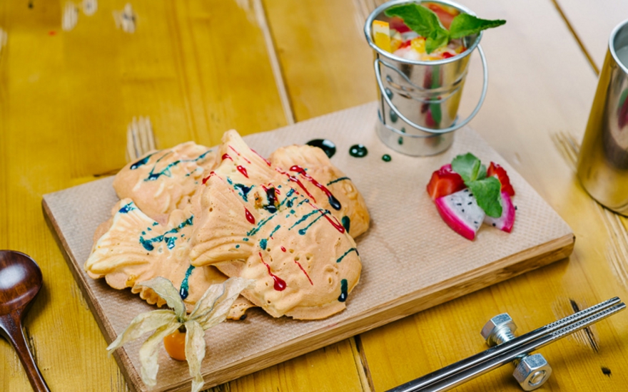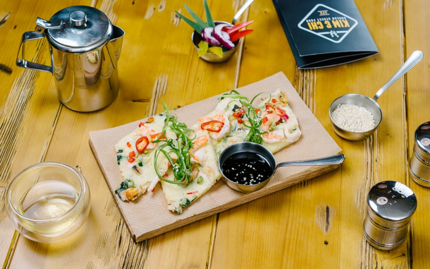 Одна из особенностей корейского стритфуда — подача на разноформатных палочках: на них тут нанизывают жаренные во фритюре куриные крылышки в остро-сладком соусе, тигровые креветки темпура с васаби и панировке из миндаля, шашлычки из морепродуктов в мягком кунжутно-соевым соусом, охотничьи колбаски — либо в панировке из кукурузной муки, либо в кусочках картошки фри, и, наконец, картофельный чипс торнадо. К экспериментам тут располагают и обстановка: желтый цвет пластиковых стульев, дракон на потолке, летящий по желтому же небу, фудтрак, увешанный гирляндами лампочек — все это бодрит жизнерадостностью, а саундтрек из корейской попсы, на слух как будто запись Андрея Губина пустили реверсом, вводит в приятный транс.