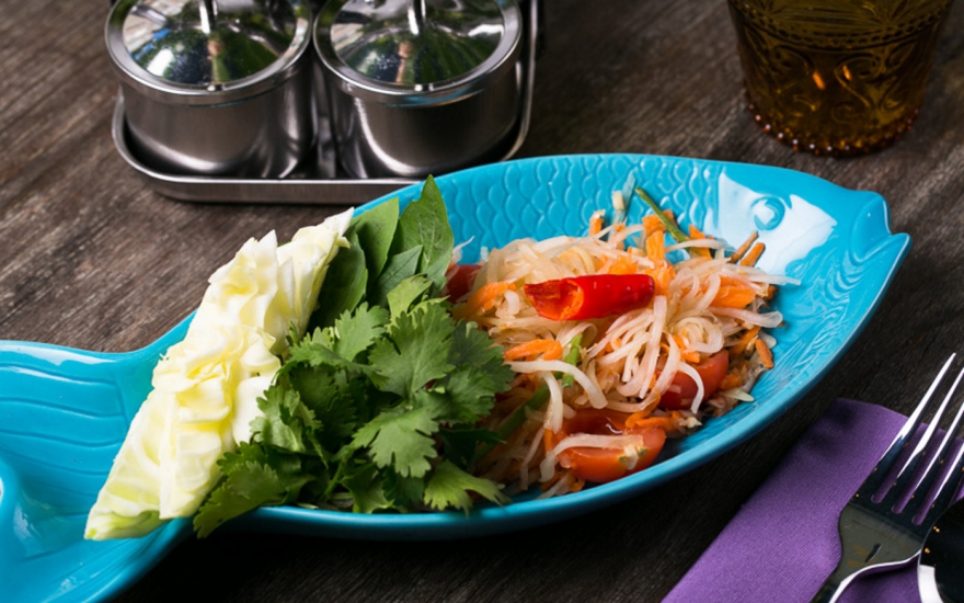 Две комнаты «Тайки» не утомляютэтникой, но теплое ощущение южного буйства красок хорошо чувствуется. Желтые, красные, синие, голубые, фиолетовые стулья своими узорными спинками чем-то напоминают лепестки повсеместных в Тайланде цветов тропических деревьев плюмерий. Хотя совладелица Инна Преображенская говорит, что «Тайка» — не паназиатский, а именно тайский ресторан, меню получилось такое большое и разностороннее, что нашлось место даже митболам. Из аутентичных тайских блюд можно отметить, например, сом там — салат по духу чем-то напоминающий коул слоу, только с зеленой папайей, помидорками черри и арахисом, као сой — суп северной провинции Чанг Май с хрустящей яичной лапшой и золотым карри.