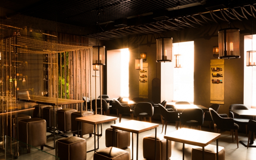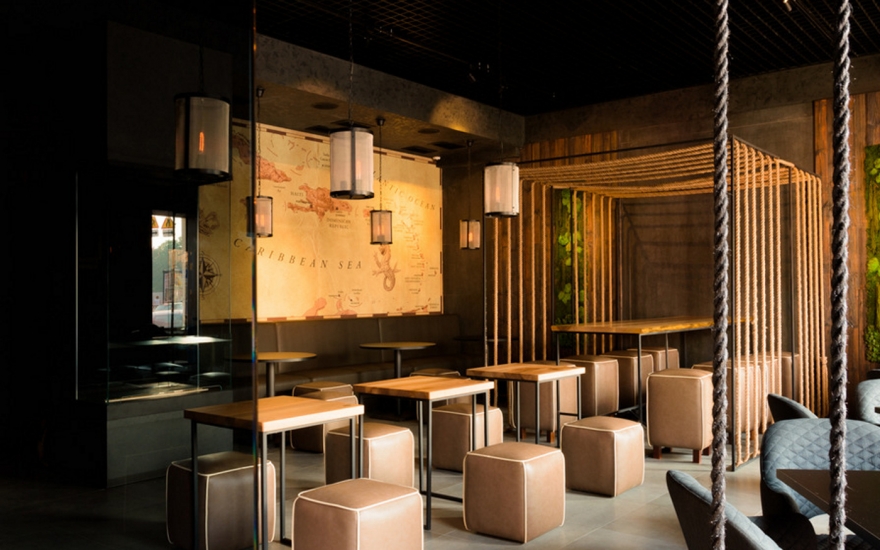 Фотограф Антон Рудзат просит нас перескочить за столик на фоне стилизованной под старину карты Карибского моря. Оттуда открывается обзор на гостей заведения: взрослые люди, часть из них иностранцы, за соседним столом у парочки свидание — интимная обстановка располагает.