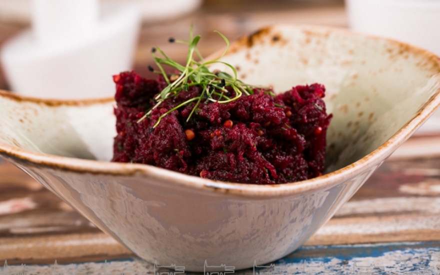 Тартар из сырой свеклы с травами и зерновой горчицей