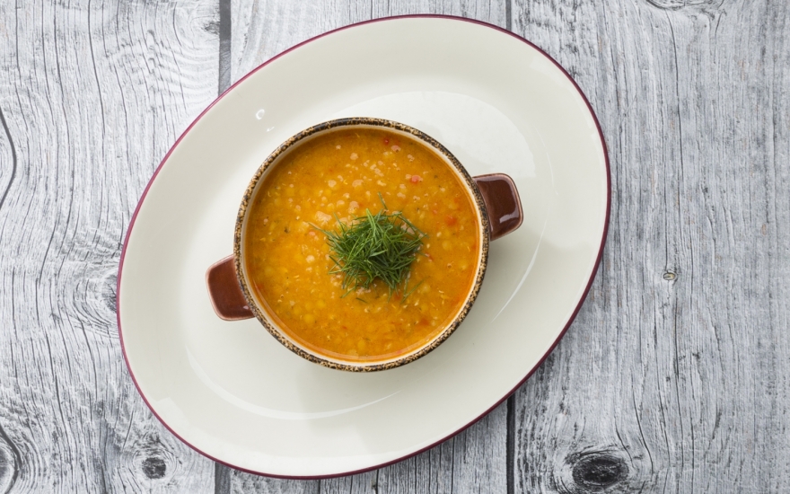 Похлебка варится на крепком овощном бульоне с чечевицей цвета полуденного солнца, с овощами-томатами, красной и желтой паприкой. Овощи предварительно обжариваются с чили, чесноком и свеженатертым свежим имбирем — три последних компонента добавляют эндорфинов.