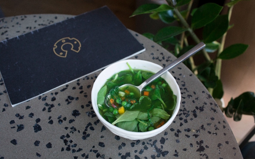 Необычное название супа — из-за минимальной калорийности, а так-то ингредиентов в супе хоть отбавляй. Многочисленные овощи для постного супа в «Сырнике» — от шалота до вяленых помидоров с морковкой и цукини — режутся в мелкий кубик и варятся в овощном бульоне с добавлением серьезного количества шпината.
