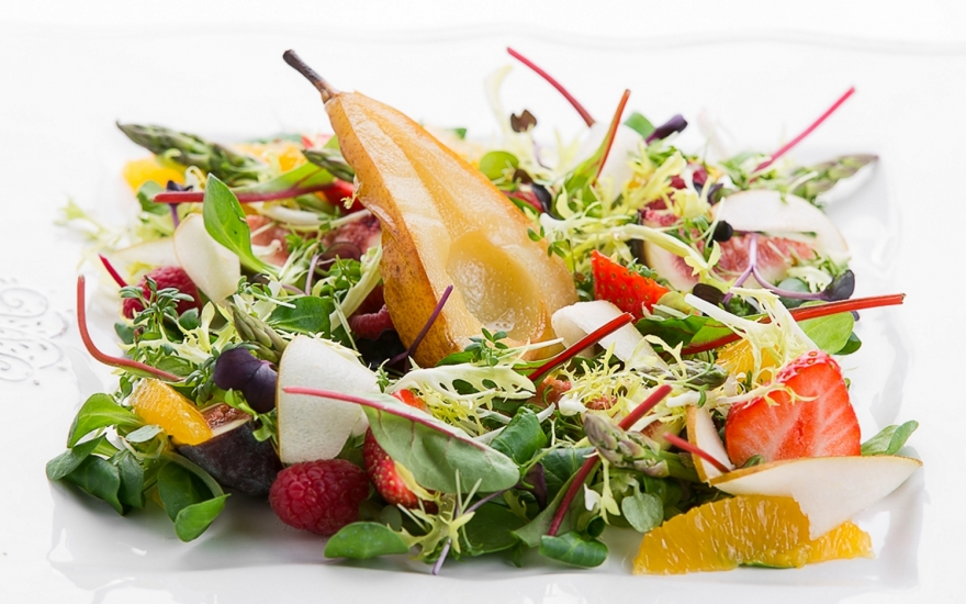 Этот салат в ресторане на Миллионной улице заслуживает названия «Витаминный»: что ни ингредиент, то чистая польза. Зеленая спаржа и клубника, манго и апельсин, свежий инжир и зеленые салатные листья. Венчает список томленная в меду и с кардамоном груша.