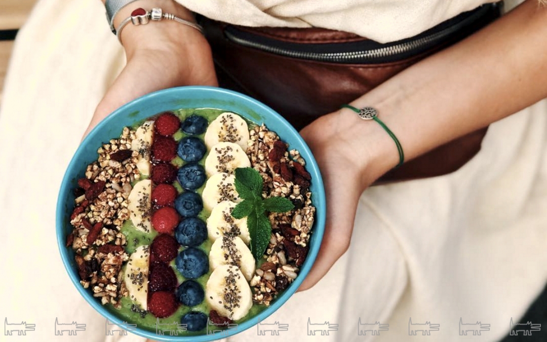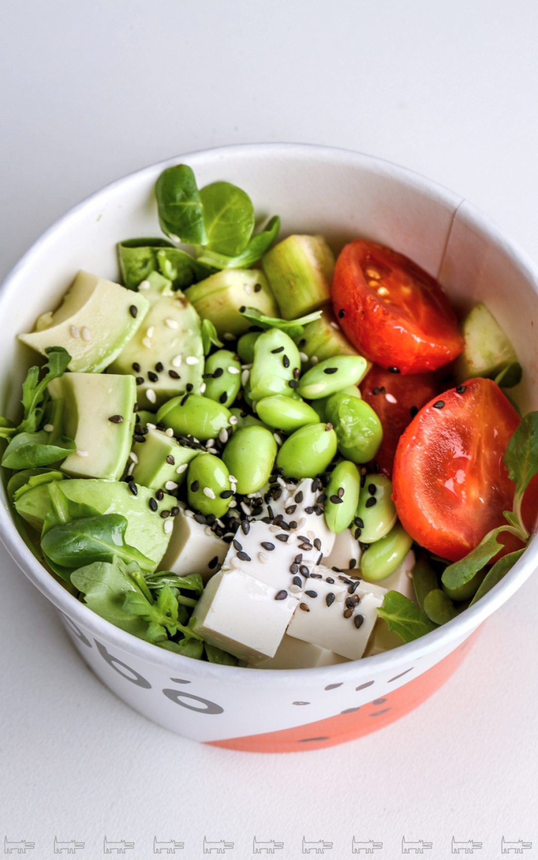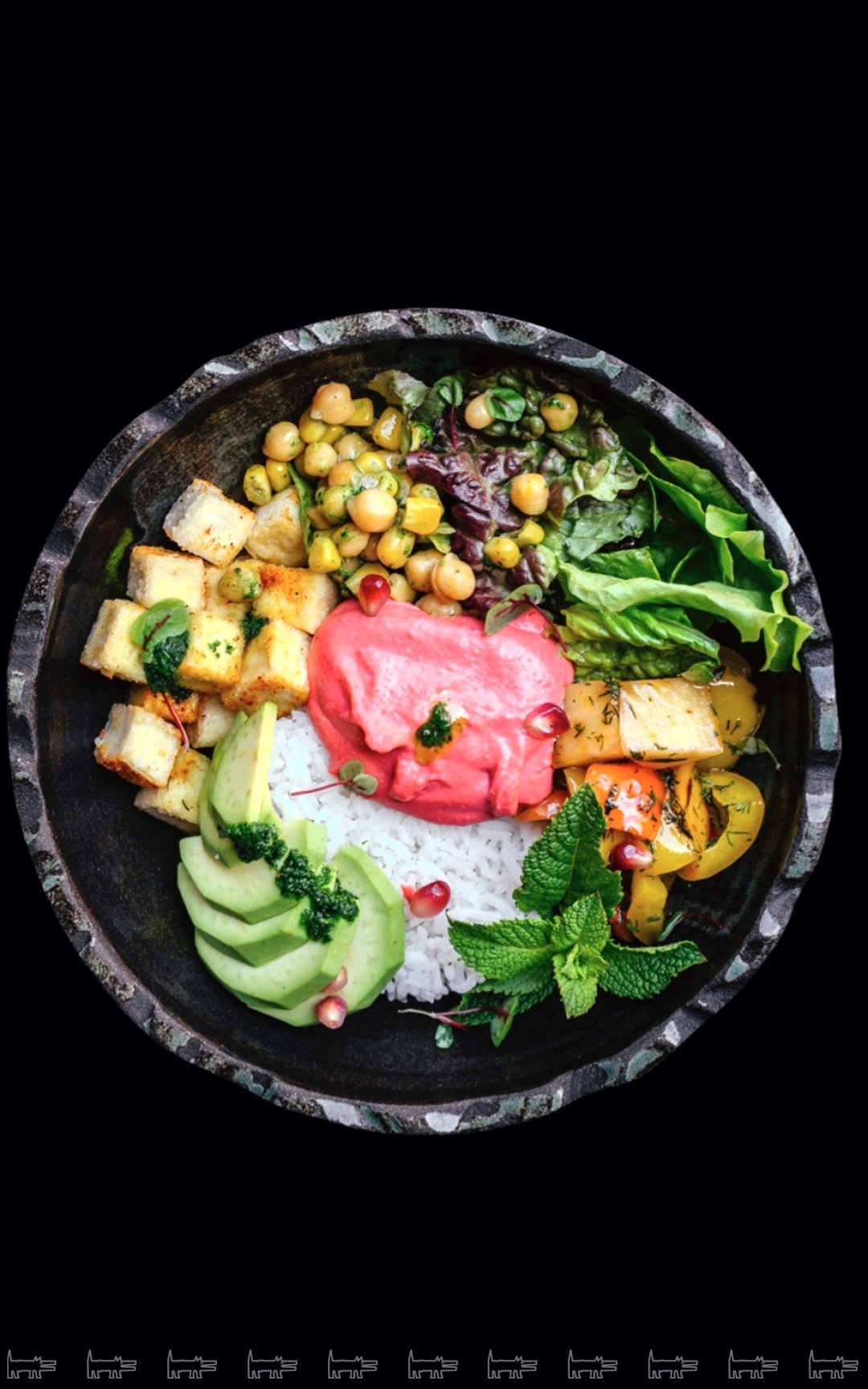 Плошку с полезными продуктами, уложенными беби-порциями, зовут боулом или чашей Будды: по легенде, Просветленному в миску прохожие клали понемногу еды, пока не получалось полноценное блюдо: здесь просветления достигают, сложив тофу, авокадо, рис, хумус, нут, ананас, кресс-салат, кунжут и немного чили.