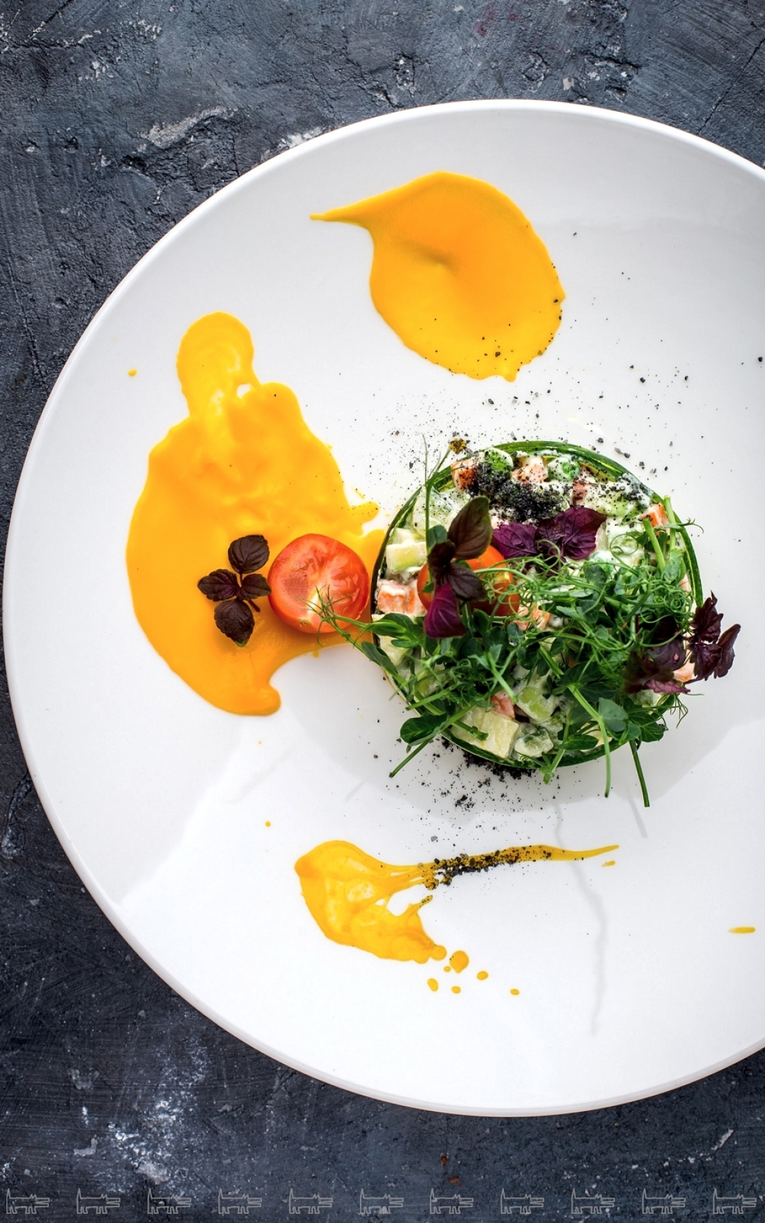Изобретательная вегетарианская панацея для всех, кто не мыслит застолье без главного салата страны: в рецепт входят свежий и маринованный огурец, кабачок, авокадо, горох и его ростки, морковь, лук, черри, черная соль и майонез из кешью.