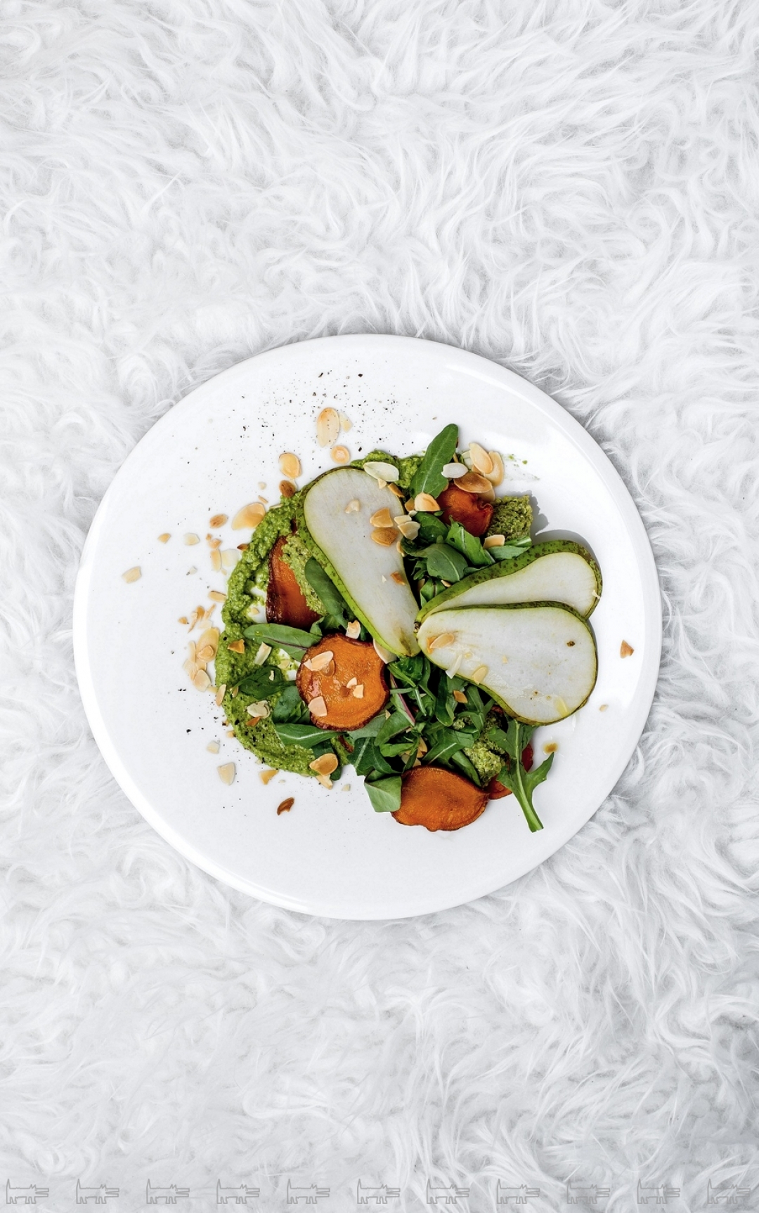 В вегетарианском кафе Наташи Олиной листья рукколы смешивают с киноа и кунжутной пастой с огуречным соком, нарезают спелую грушу и батат слайсами и посыпают сверху миндалем — на выходе получаем внушительную порцию салата, который вполне заменит еще и десерт.