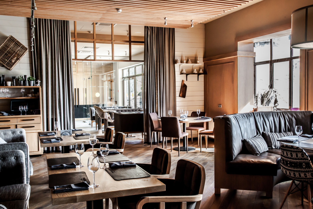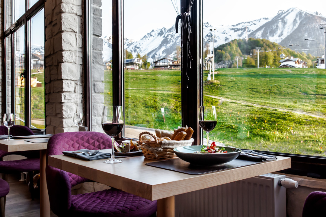 Интерьер ресторана идеально иллюстрирует его новую концепцию, но при этом служит продолжением стиля альпийского шале, который был выбран еще при открытии заведения. Барная стойка выполнена из внушительного деревянного сруба, в кашпо растет розмарин, на стене в дальнем зале изображен фирменный краснополянский туман – своеобразная визитная карточка местных гор. Самое притягательное место – закрытая терраса, из окон которой открываются панорамные виды на заснеженные вершины хребта Аибга.