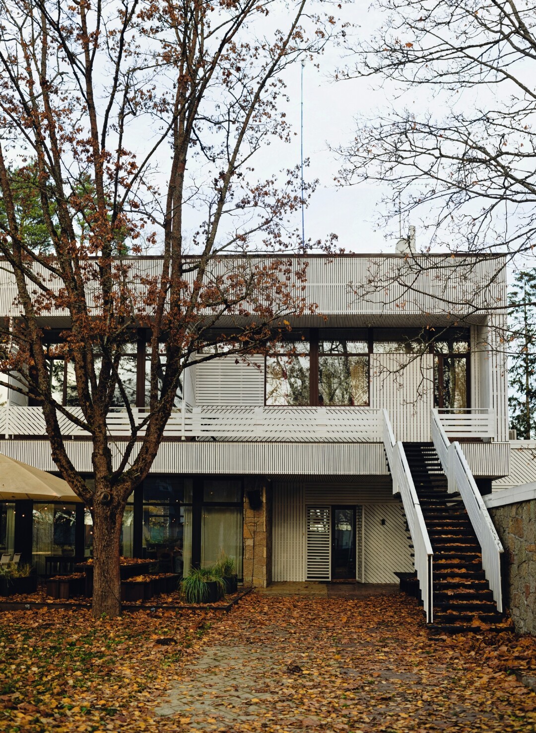 Амбиции быть культурным центром Muze Garden заявил с самого открытия летом 2022 года. Кто не доехал сюда на концерт Михаила Феничева (2h Company, «ЕстьЕстьЕсть») в рамках арт-фестиваля «Курорт», тот побывал здесь на любимой городской ярмарке искусства «Из профессорской квартиры», которую каждый сезон устраивает KGallery. Для многих впечатлением стал не только сам Muze Garden, но и факт, что невероятный Дом творчества все это время был под боком, но о нем мало кто знал и тем более заходил. Строго говоря, Дом творчества композиторов в Репине — это не конкретное здание, а целая территория, которую в свое ведение в 1948 году получил Ленинградский союз композиторов. Корпусов — больше 20, одни — перелицованные куоккальские дачи, другие — коттеджи, построенные в 1950-х и позже. Главный корпус, в котором стал резидентом Muze Garden — постройка 1968 года: тут была большая столовая, киноконцертный зал, бильярдная и библиотека. Среди корпусов-домиков это здание — и правда, флагманский корабль, гимн архитектурного минимализма, где брутальная доминанта формы кажется даже изящной благодаря легкому стаккато реечного шага деревянной обшивки.
