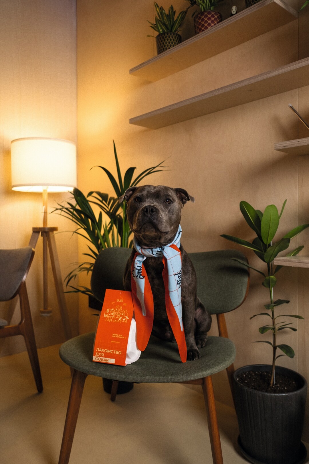 Катя: А еще у нас будут натуральные вкусняшки для собак, лежанки и поилки. Третий член нашей семьи — английский стаффорд Жора, которого можно увидеть в айдентике бистро, поэтому сомнений, чтобы быть пет-френдли, никаких не было.