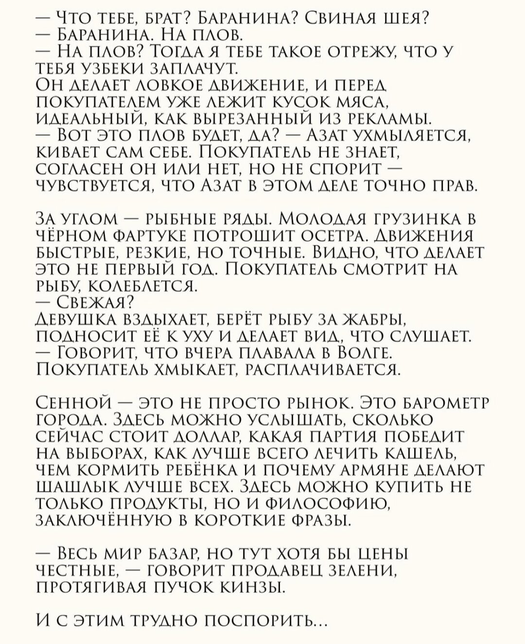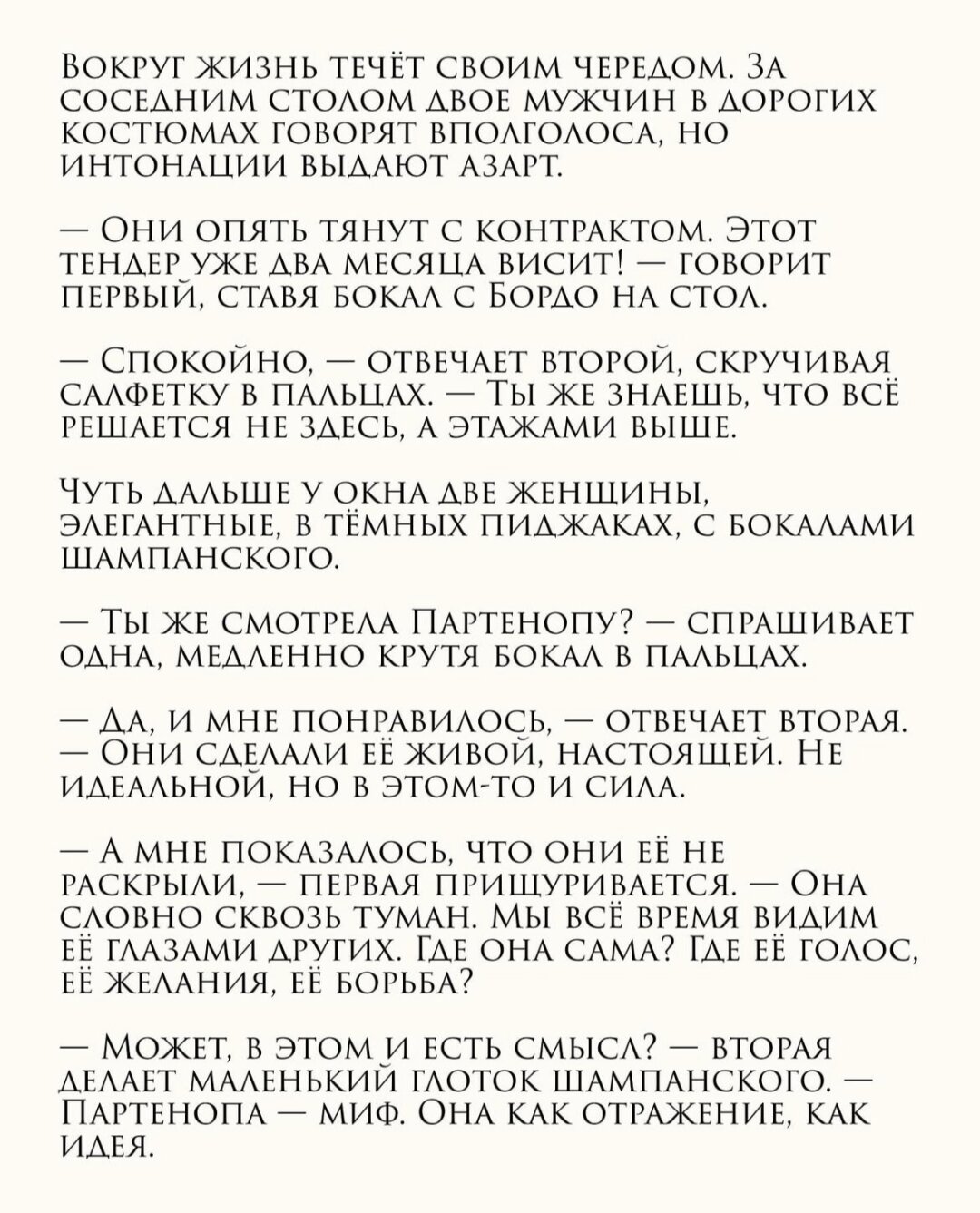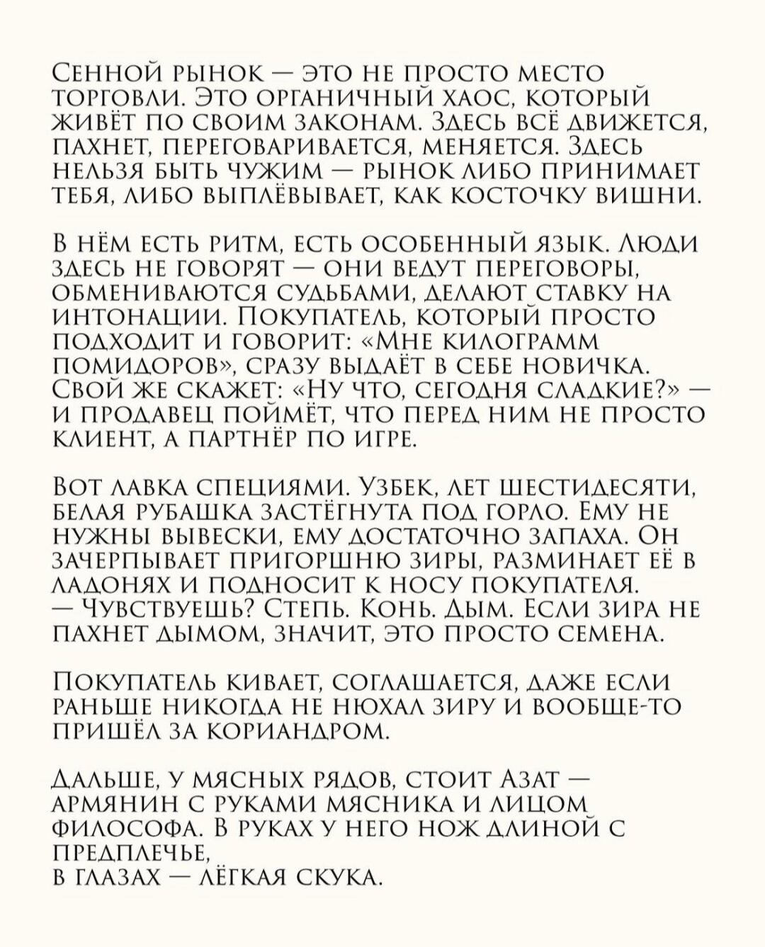 Идея в том, чтобы собирать мимолетные наблюдения, рассказывать про места и лица. Например, бывает, что я сижу на ужине с друзьями, замечаю за соседним столом интересную цитату или взгляд, а потом вокруг них выстраиваю историю. Я бы назвал это хрониками городской жизни глазами человека, который любит оставаться в тени.
