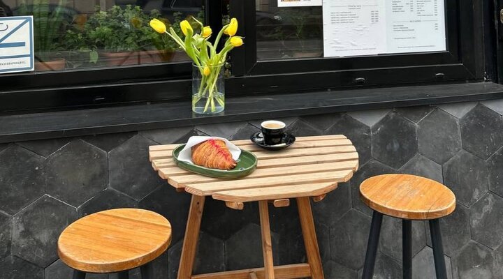 Формула весеннего умиротворения: тихий двор, деревянная мебель, горшки с цветами, десерты и спешлти кофе.