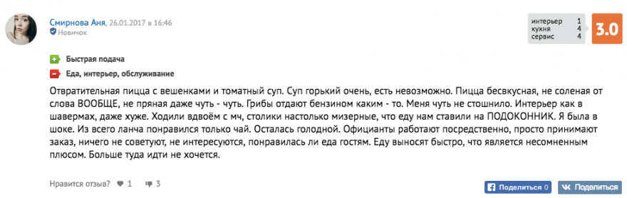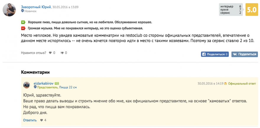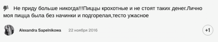 Вот пишет о Pizza 22 некая Ksenia Eduardovna, орфография и пунктуация сохранены: «Есть, конечно, можно, но не нужно! Цена качество не соответствует! А рейтинг 9.0 это обман, накрученный SMM щиками. Еда не эко не био, очень все канцерогенно и не homemade!!! Не советую!!!». Не эко! Не био! Разумеется, я обозначил под этой заметкой то, что думаю, — кстати, стараюсь лично отвечать на все отзывы. Были комментаторы, которые тут же отписались, что «хамоватые комментарии официальных представителей» испортили им впечатления о месте, — пускай, гость не всегда прав. У каждого своя грань, в каких случаях можно публично высказаться по вопросу адекватности своих гостей: надо стратегически продумать несколько шагов вперед, прежде чем публично говорить о ком-либо, иначе хайпанешь сейчас и останешься ни с чем потом.